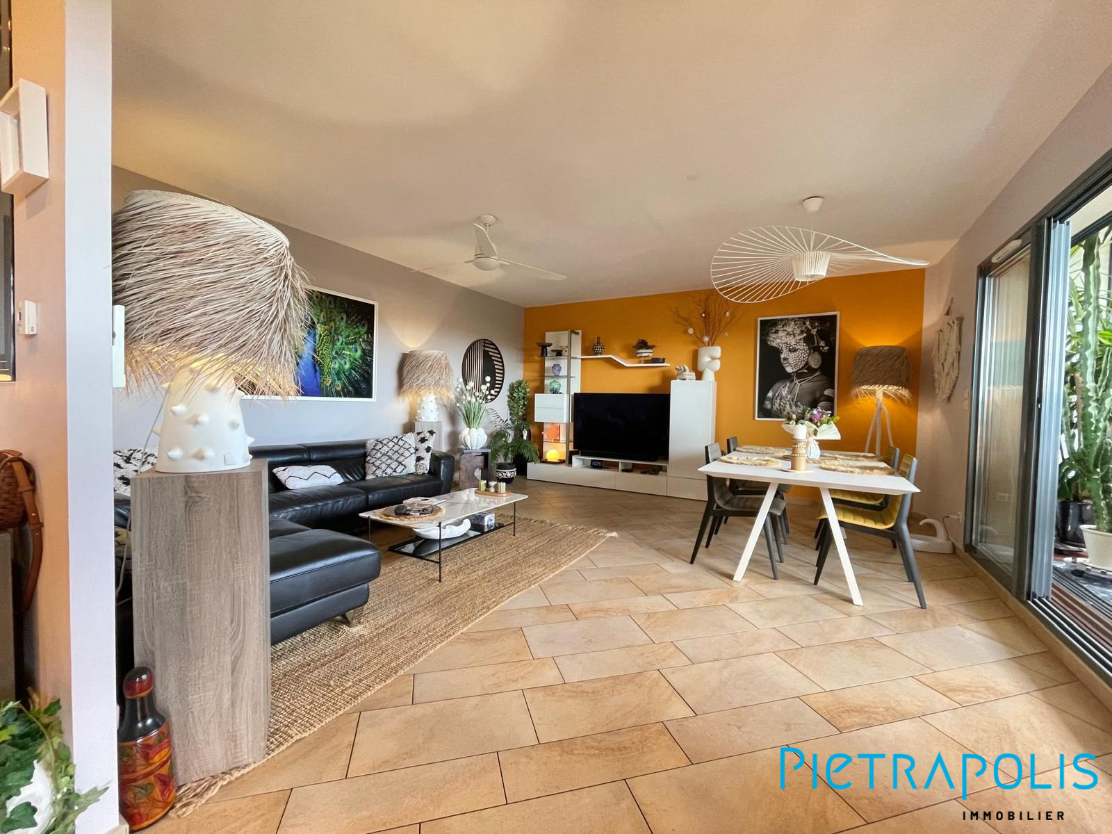 ... de : Un séjour/cuisine équipée offrant un espace de vie lumineux et convivial avec un accès direct...