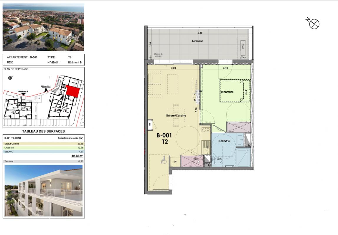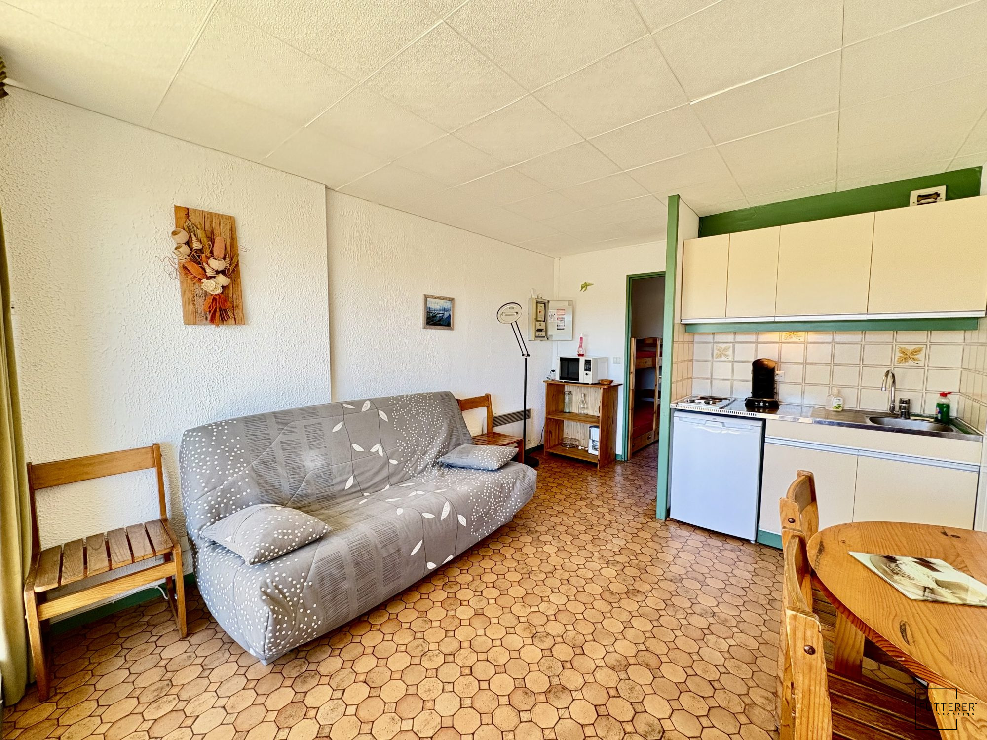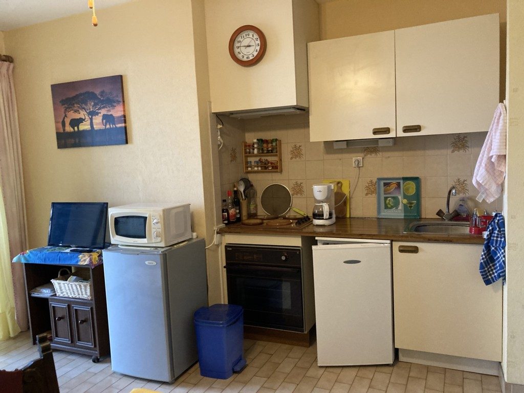 ... de 9m2, petite vue mer, entrée desservant séjour / cuisine équipée, chambre avec placard, salle d'e...