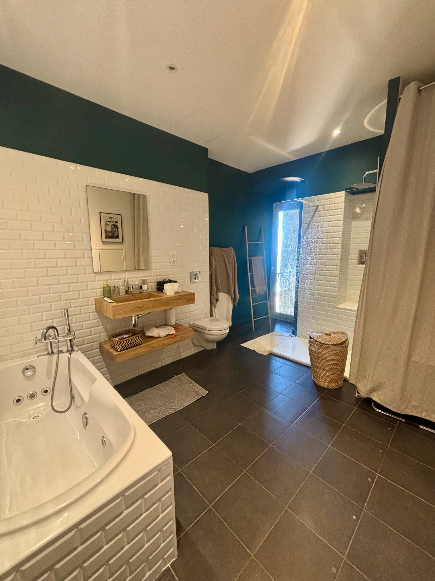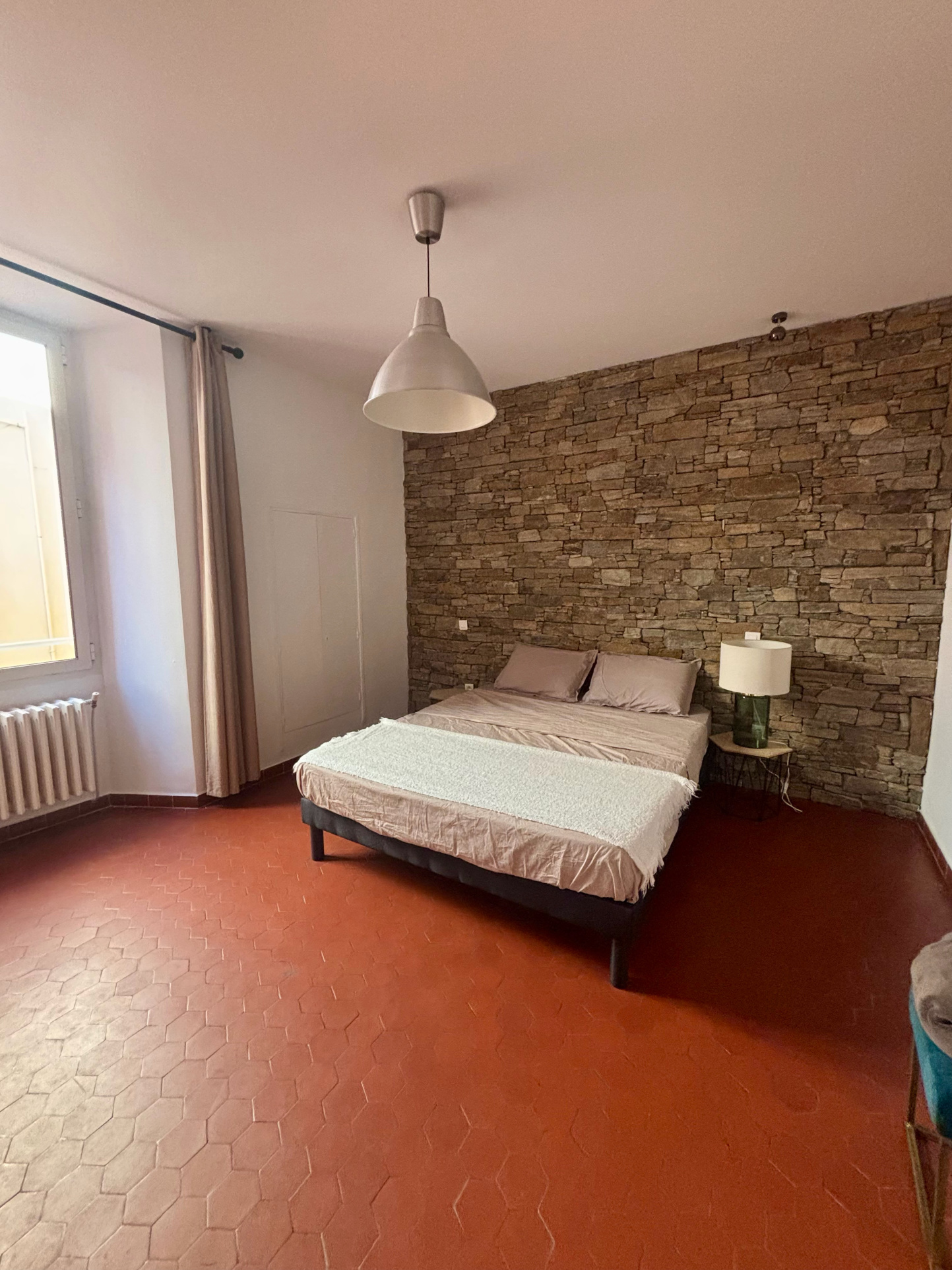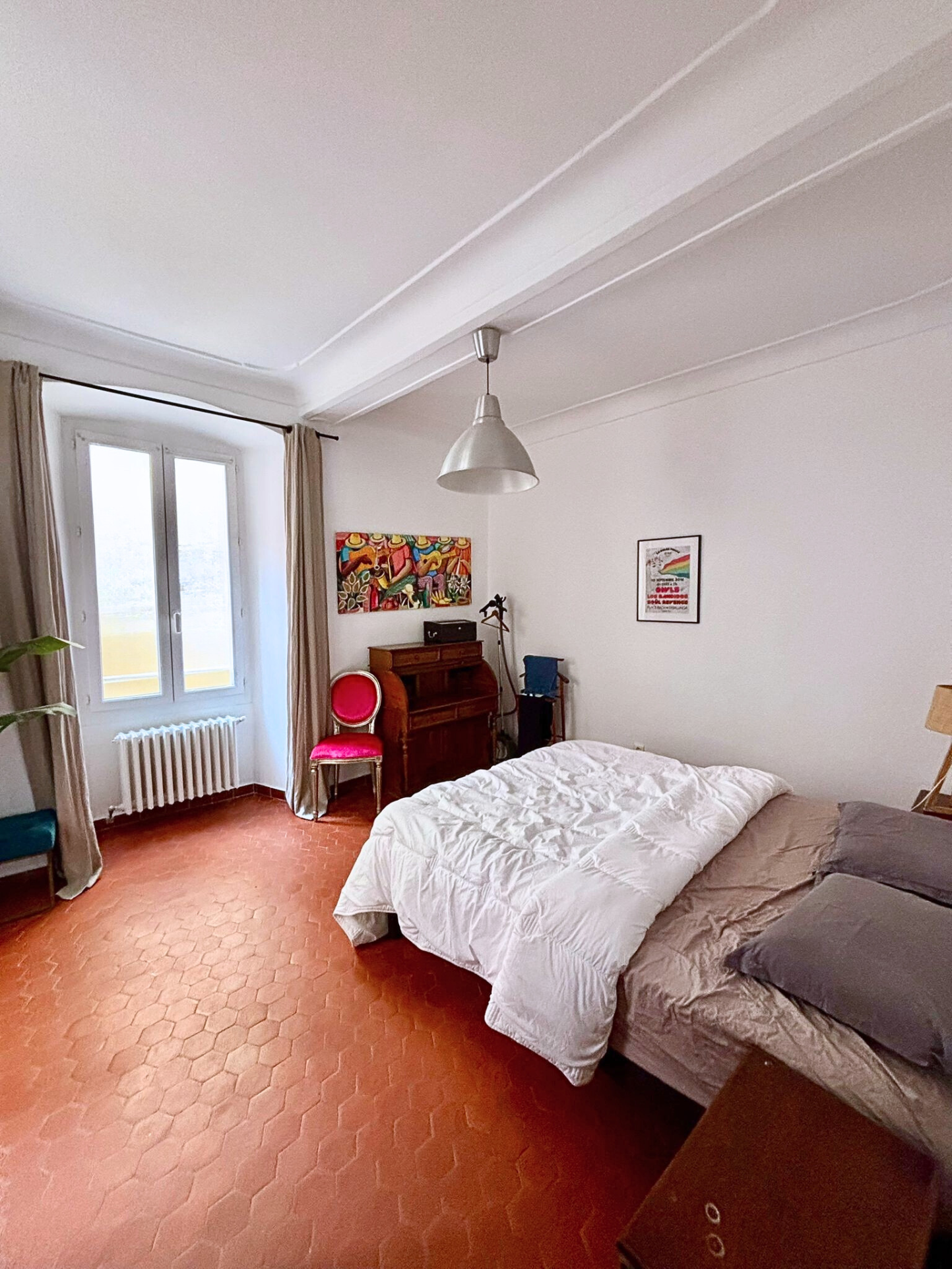 ... Le charme de l'ancien sous les toits avec ses tomettes et sa cheminée.