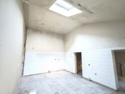 ...A l'étage: Une chambre spacieuse avec poutres apparentes, dégagement, salle de bains avec wc,...