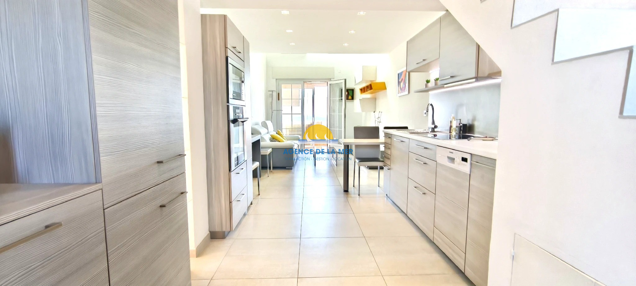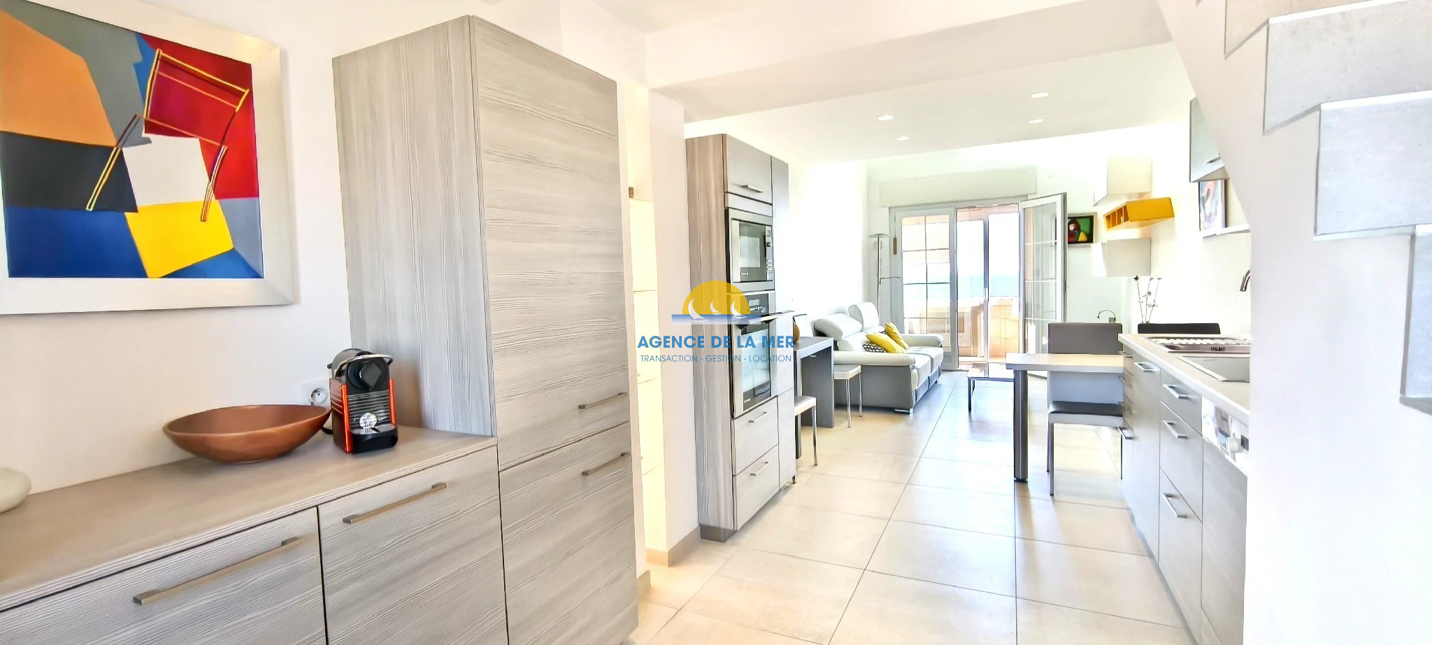 ... sur une terrasse vue mer exposée SUD et OUEST, une cuisine américaine et équipée avec accès sur l'e...