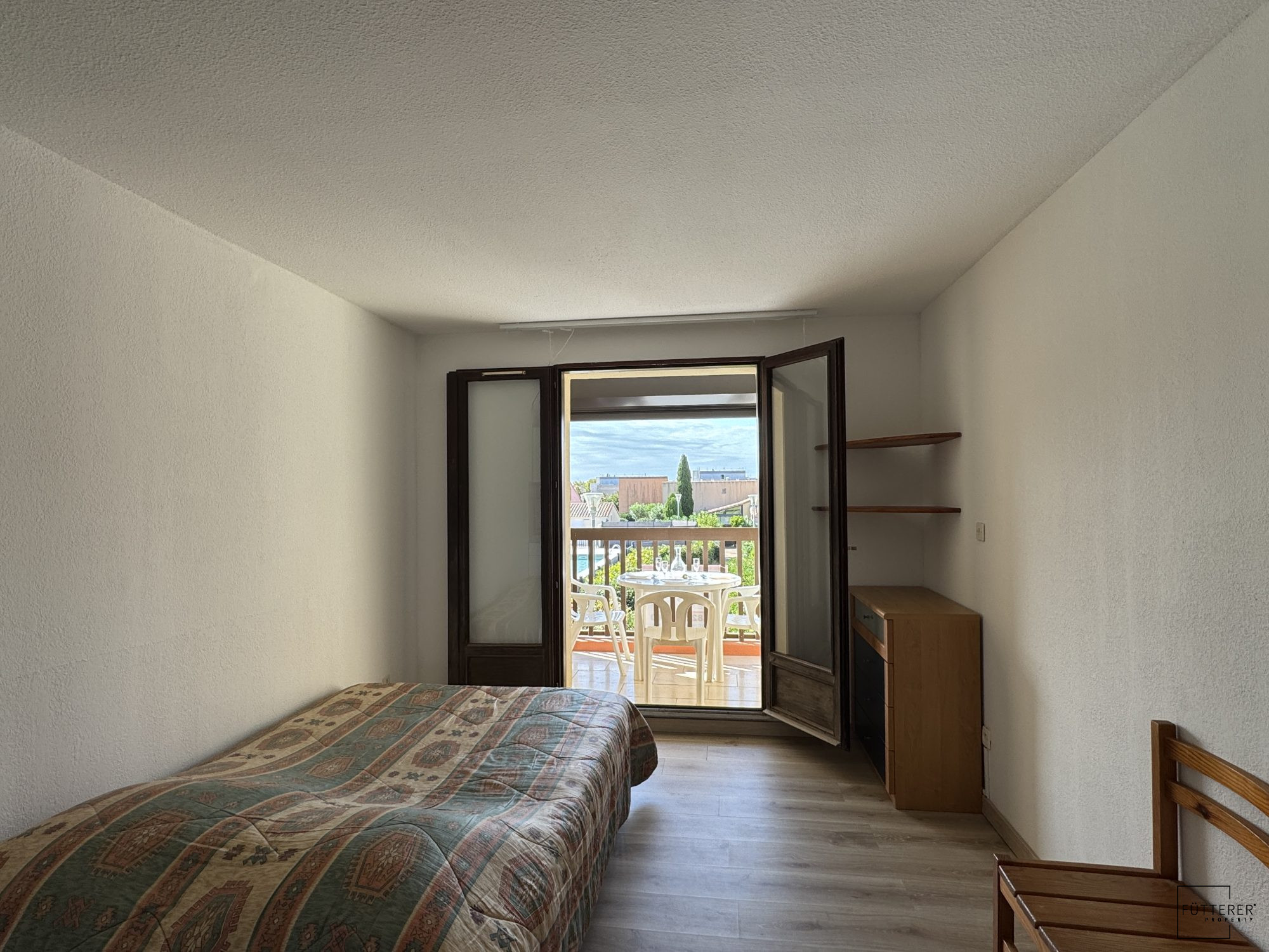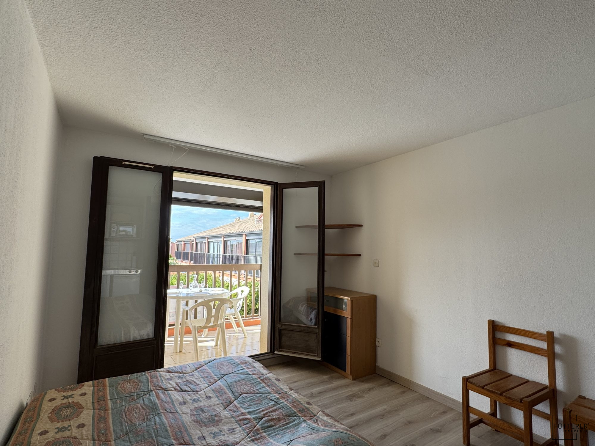 ...A l'extérieur, balcon avec coffre de rangement...