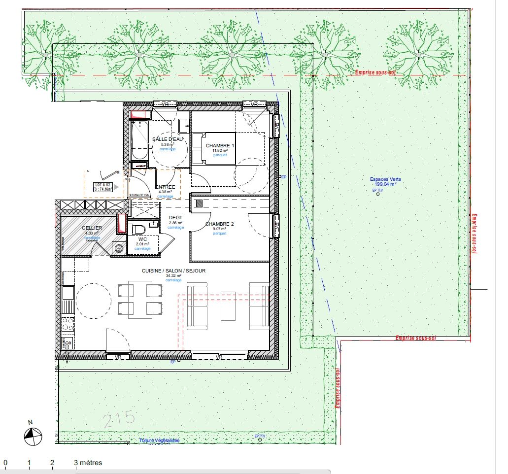 ...Grand séjour de 34 m² avec cuisine ouverteDeux chambres 9 et 11,82 m²Un cellier / buanderie de 4...
