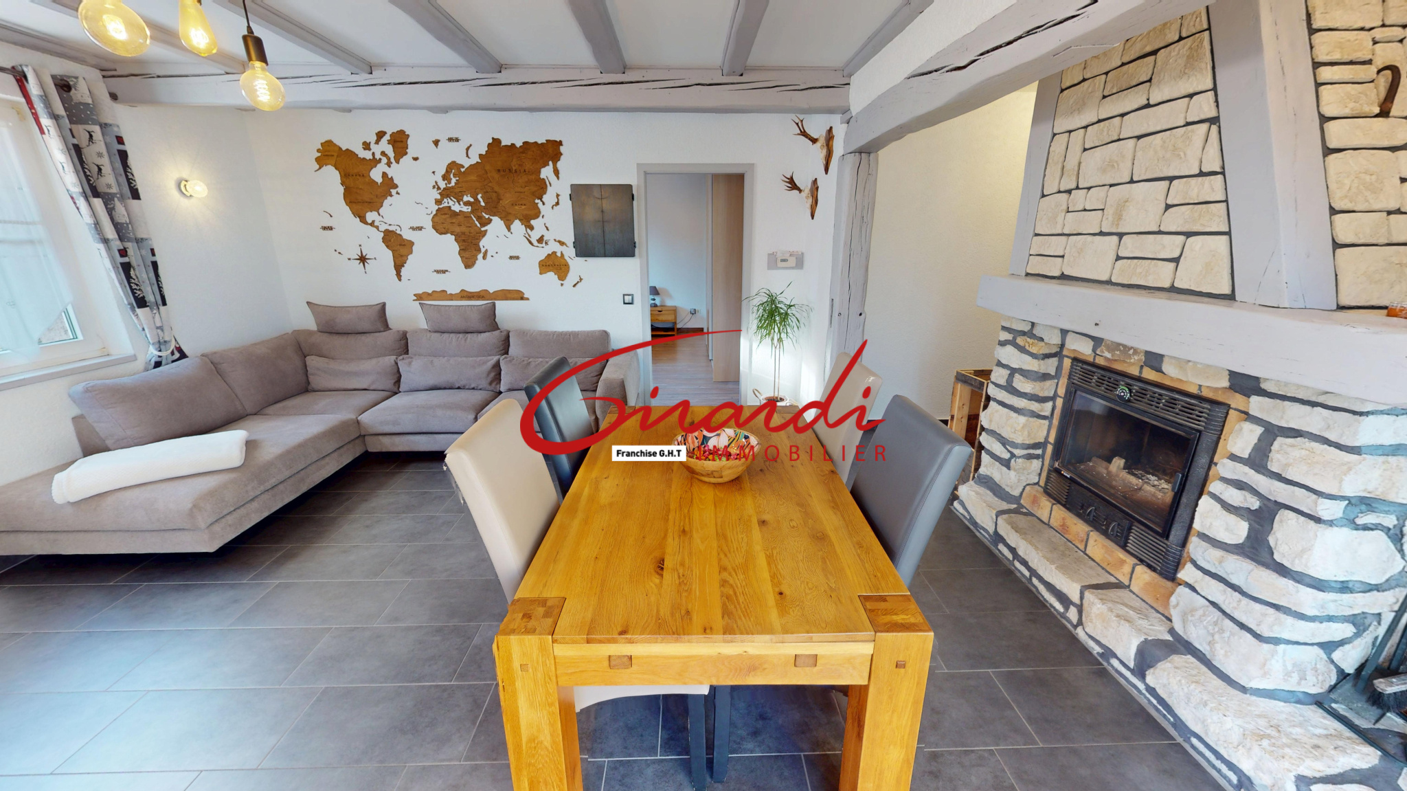 ...46m2 avec cheminée donnant sur la terrasse, une cuisine séparée, une salle de bains avec espace...