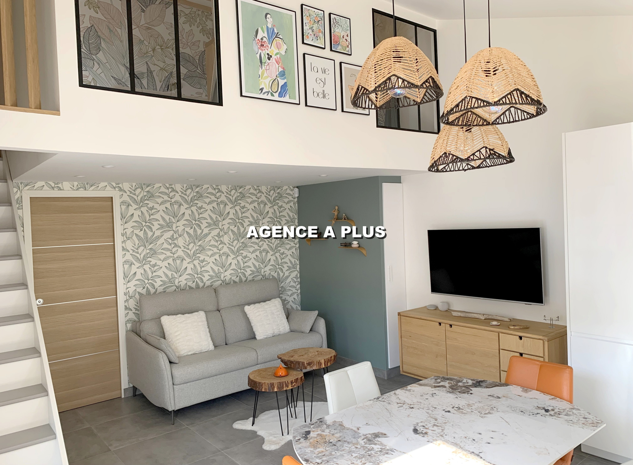... un séjour avec cuisine équipée ouverte, une chambre, une chambre en mezzanine, une salle d'eau avec...