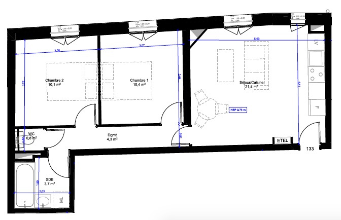 Hauteur sous plafond de 2,68m.