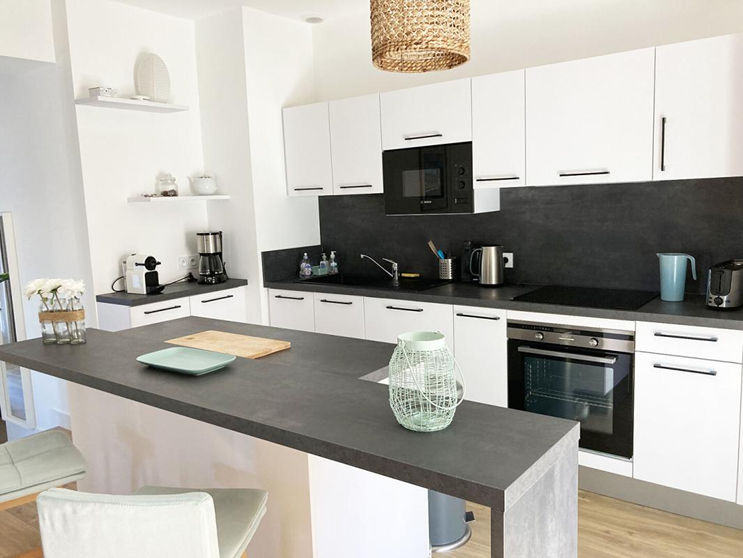 ... électrique, vue mer, cuisine ouverte aménagée équipée ( plaques à induction, hotte, four, micro ond...