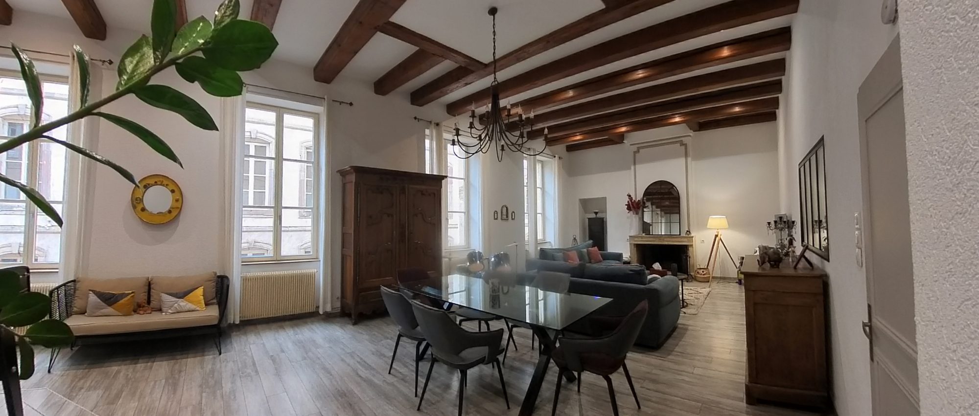 ... d'un grand séjour lumineux, offrant une magnifique hauteur sous plafond et de superbes poutres appa...