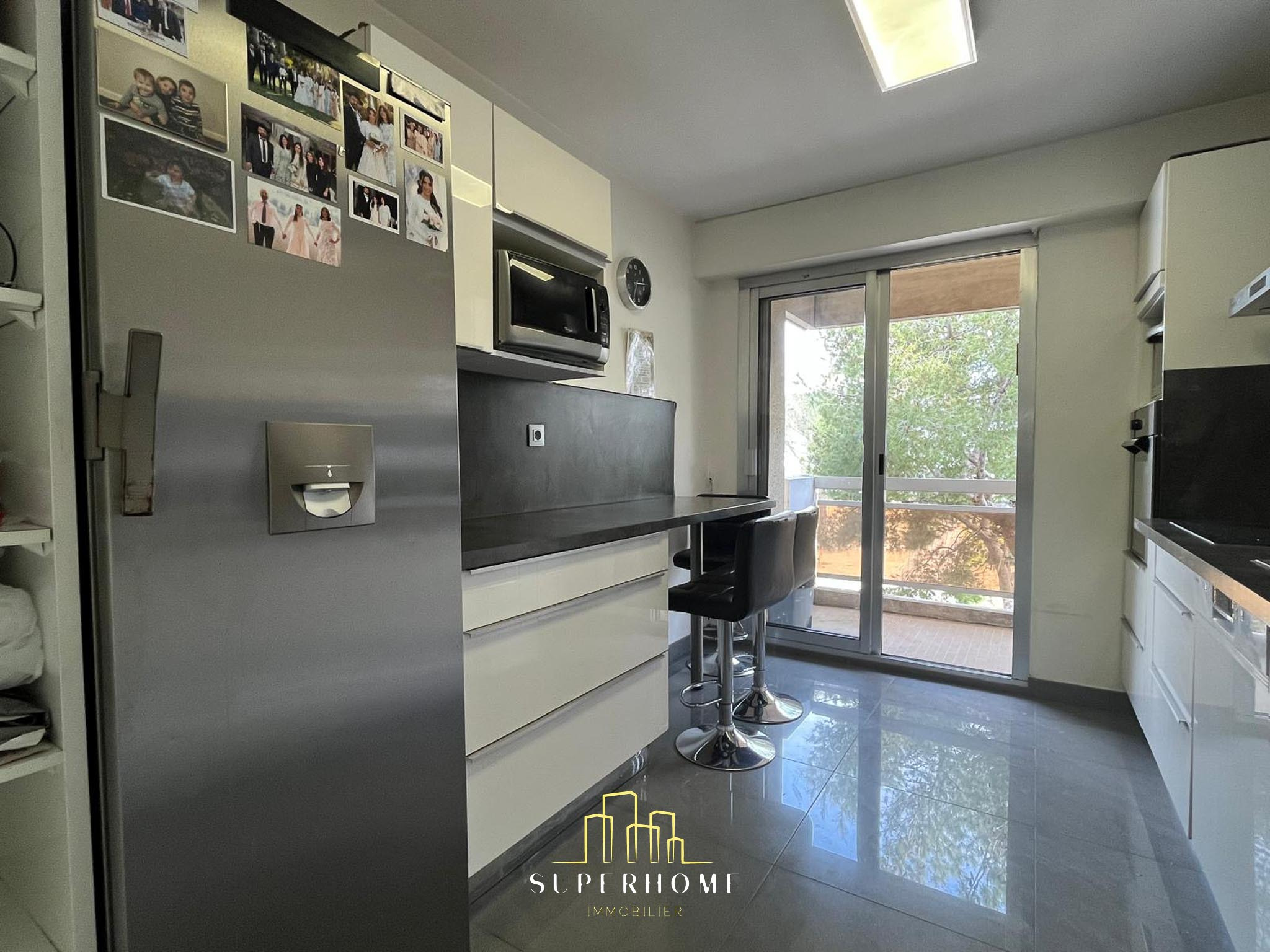 ... sur sa droite une cuisine équipée et aménagée avec un deuxieme balcon.