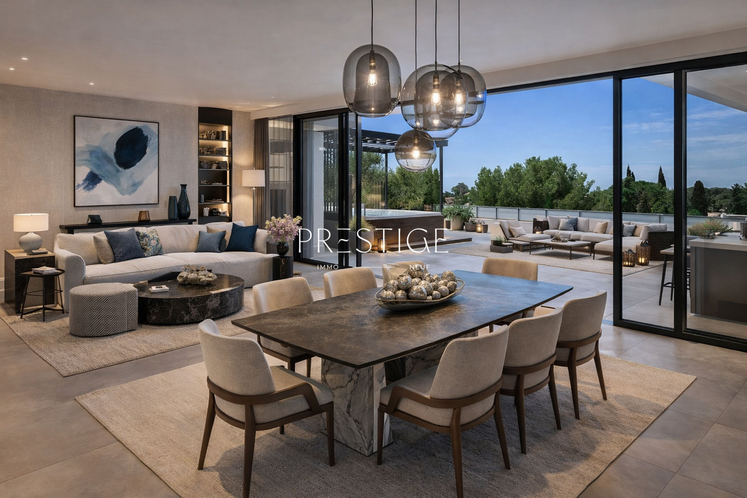 ... suspendu à la vue panoramique. Au centre, une piscine de 6,5 mètres impose son bleu outremer, miro...