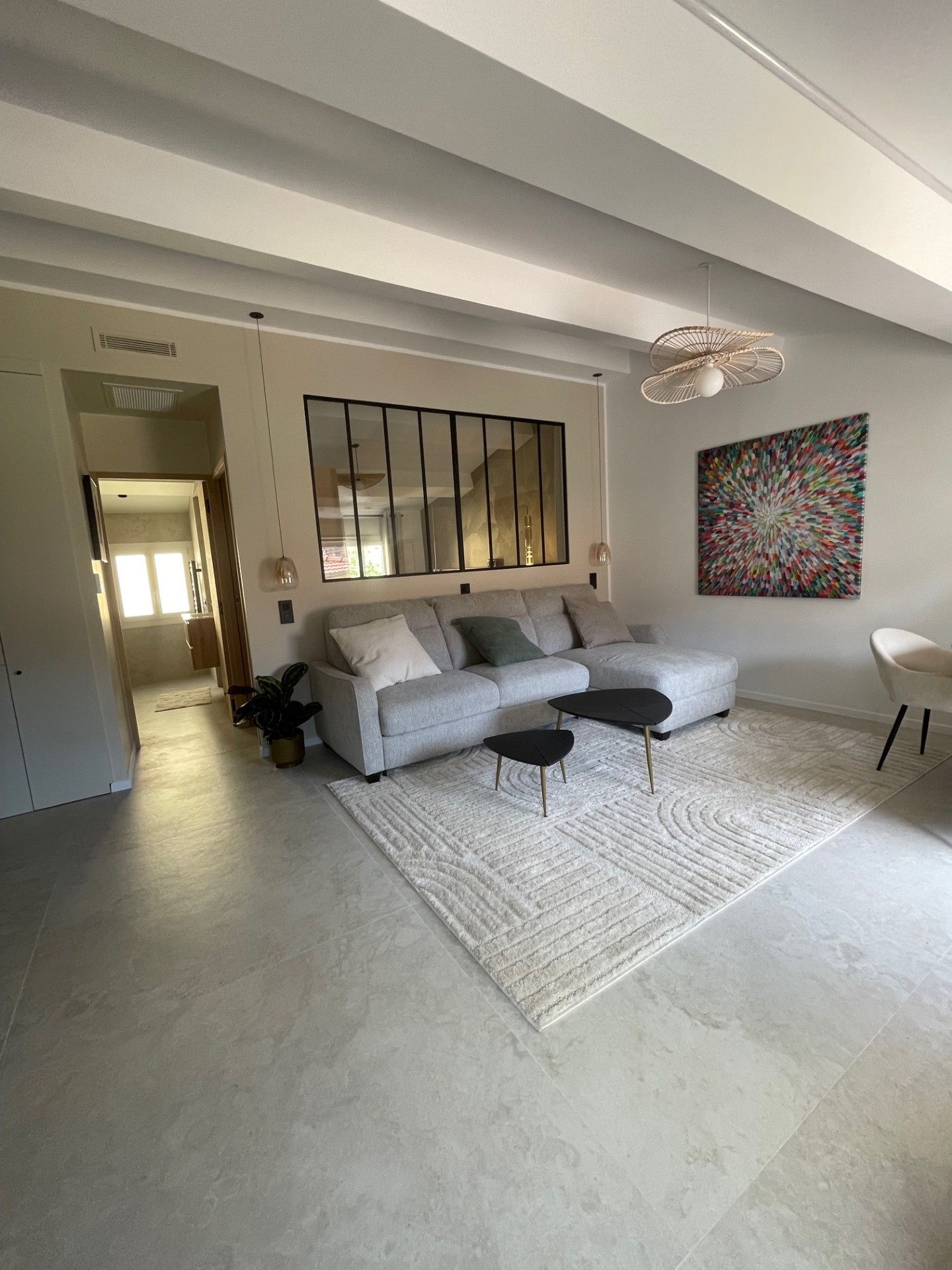 ...Le séjour, doté d'une belle hauteur sous plafond, offre un sol en mosaïque et une décoration...