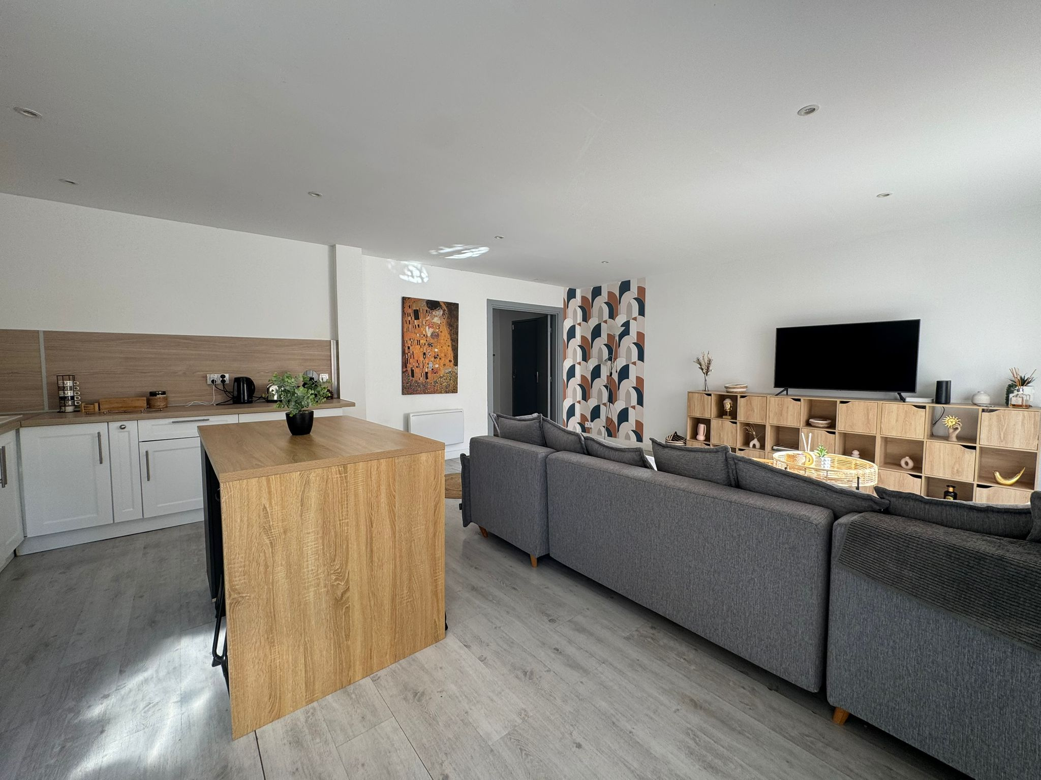 ...Composition : Une spacieuse pièce de vie lumineuse avec cuisine ouverte, donnant accès à la...