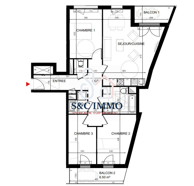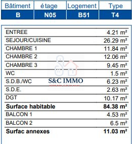 ...2 pieces de 44M2 au 4e etage exposé Sud avec balcon de 14M2 et ParkingSejour cuisine de 23M2, une...