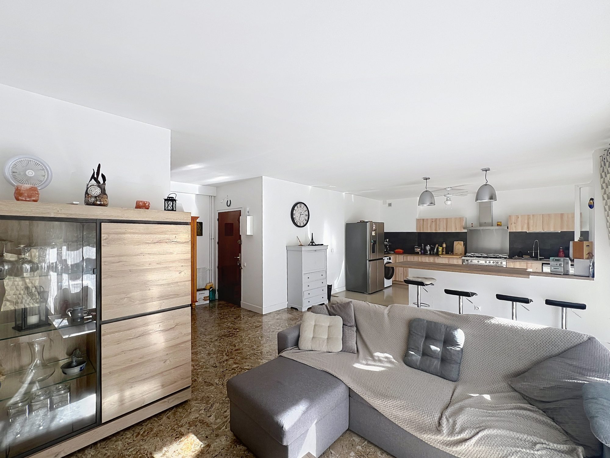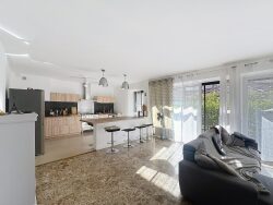 ...La pièce de vie traversante de 58 m², baignée de lumière et sublimée par son parquet chaleureux,...