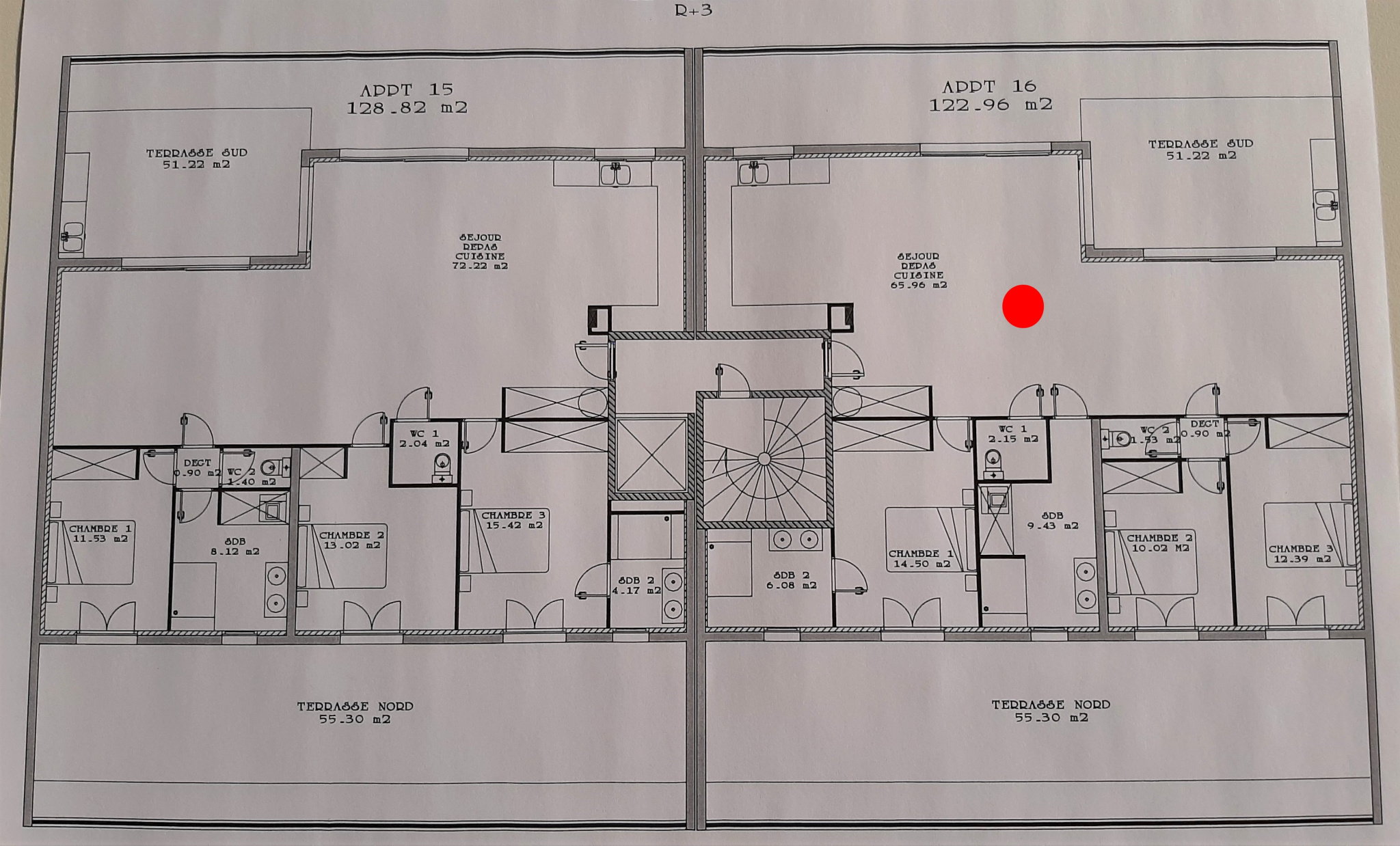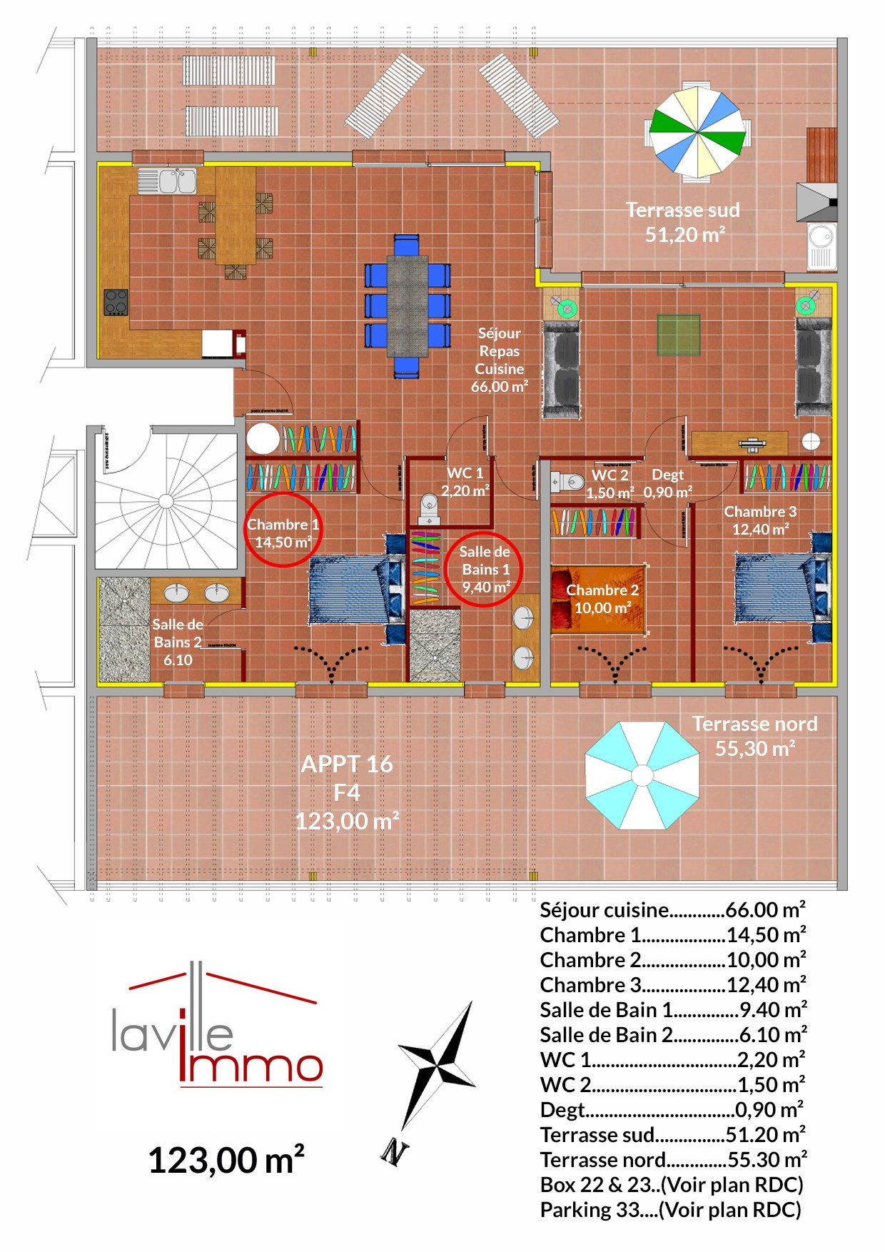 ...Il se compose d'un vaste séjour cuisine de 66m2 avec double terrasse de 51 et 55 m2...