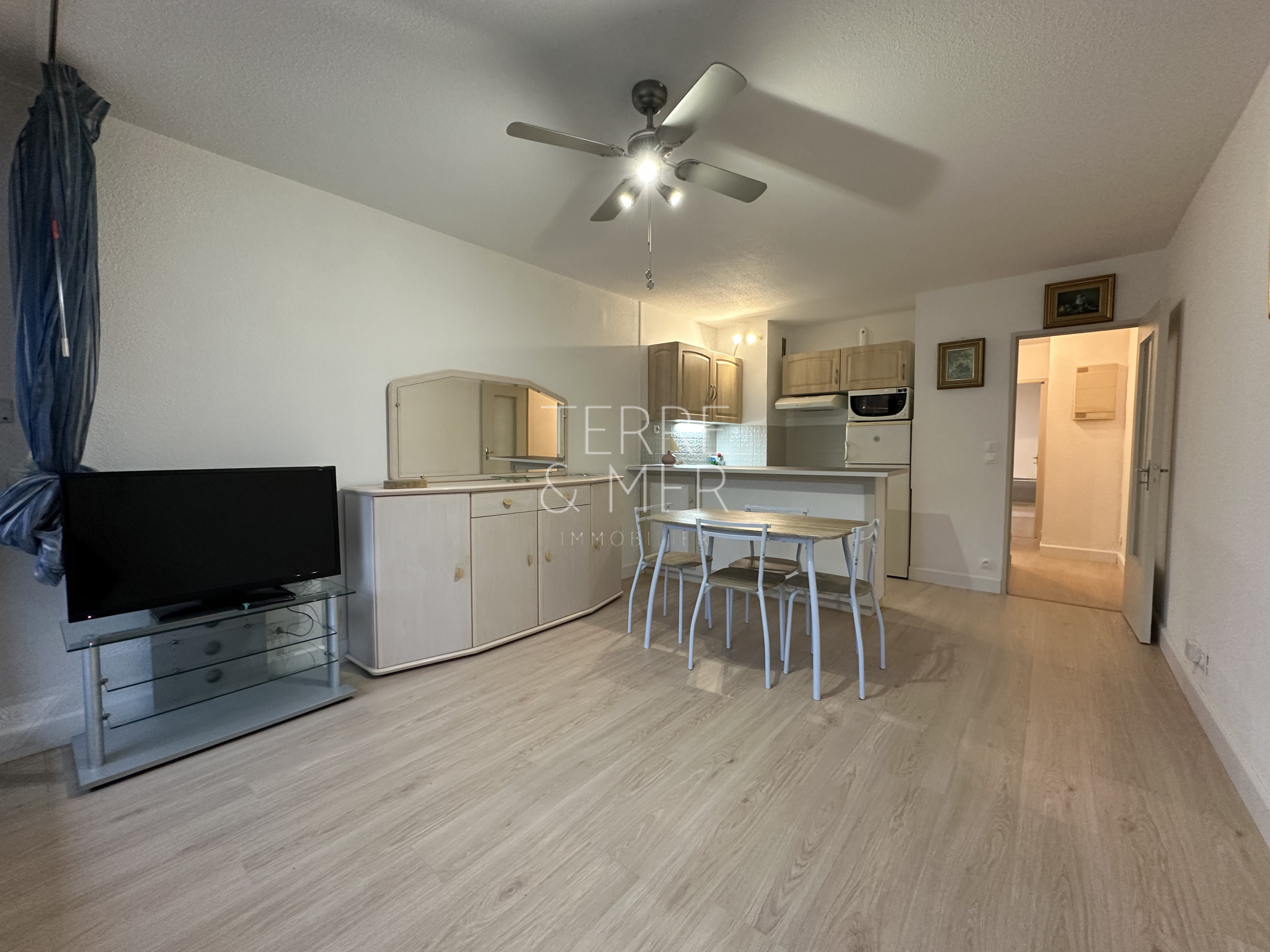 ... pièce de vie avec cuisine équipée donnant sur une terrasse, une salle d'eau avec wc, une chambre av...