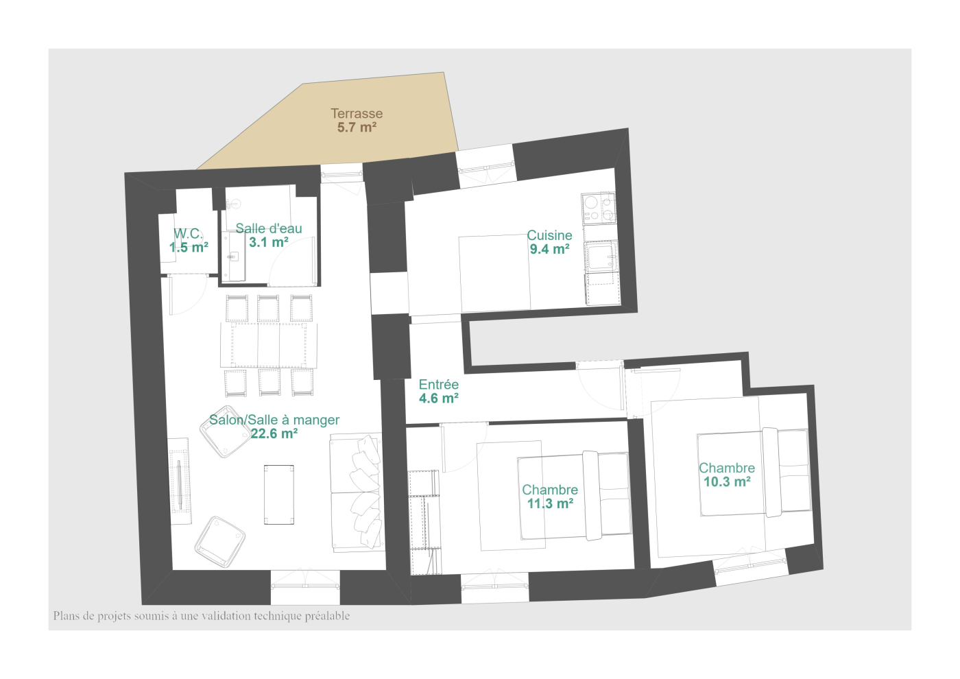 ...Comprenant une entrée, un salon/séjour, une cuisine séparée, deux chambres, une salle de bains...