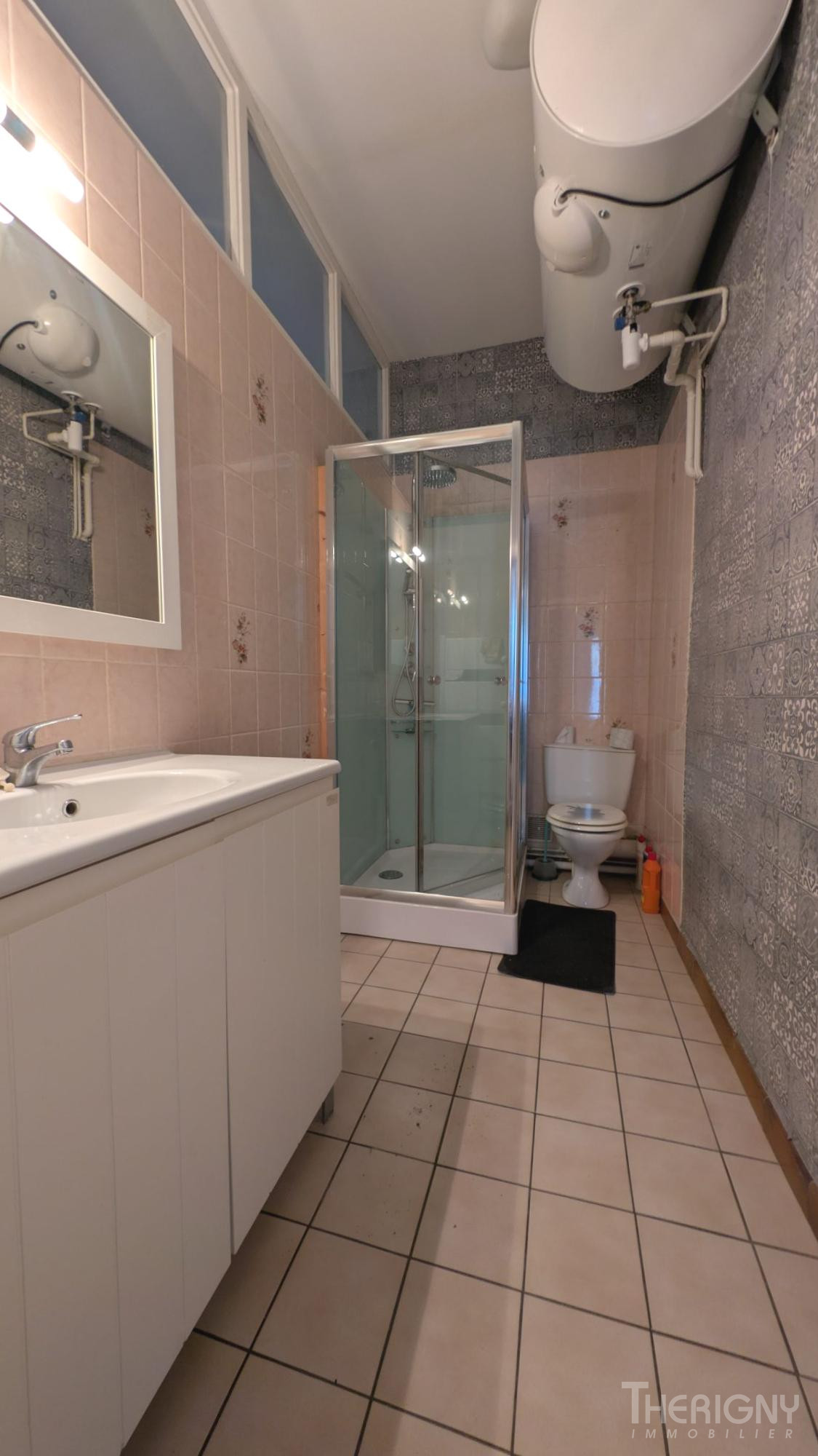 ...Le couloir amène à une salle d'eau à refaire avec une douche et placards de rangement et un WC...