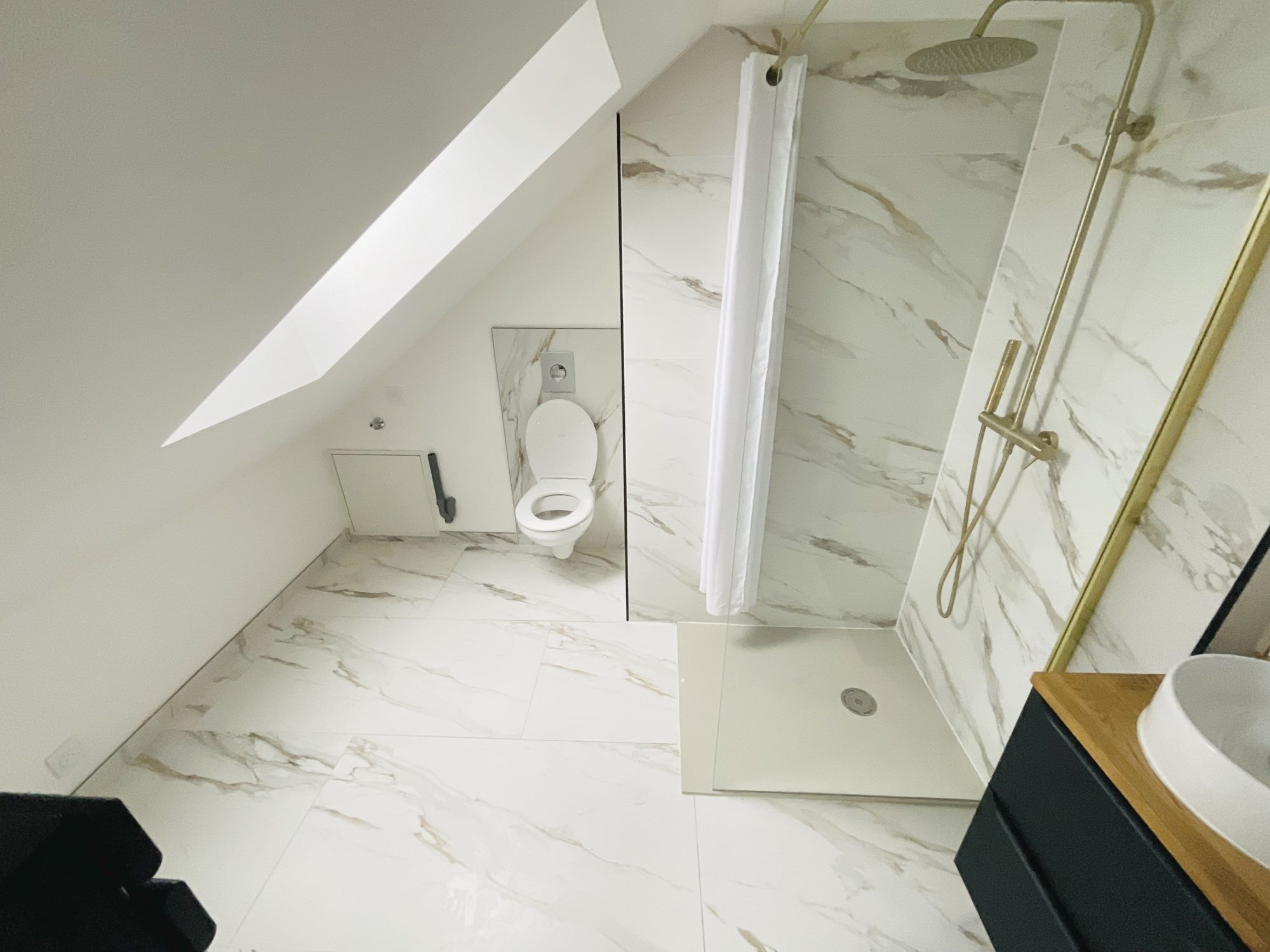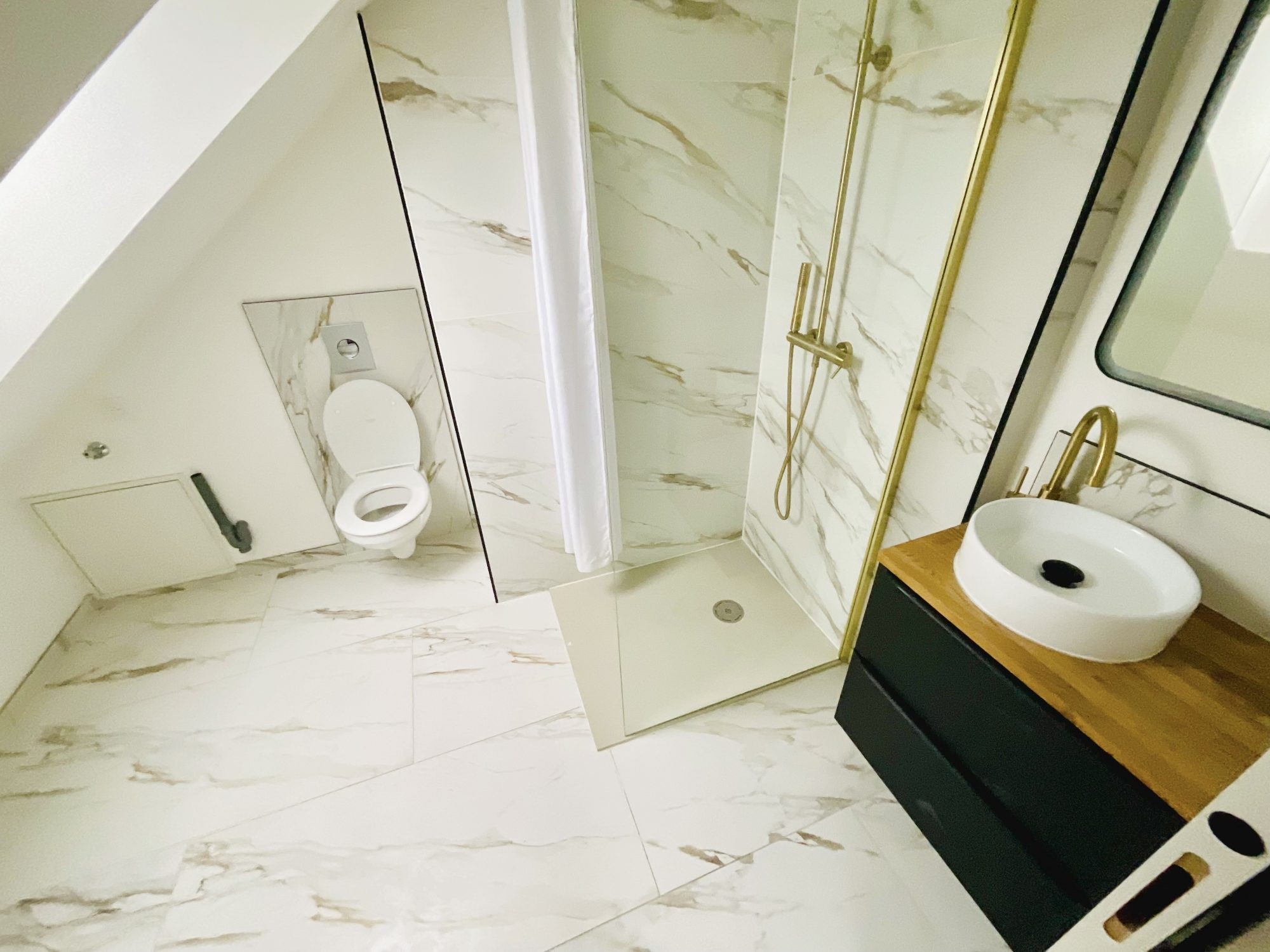...une salle de douche impeccable avec toilettes suspendues...