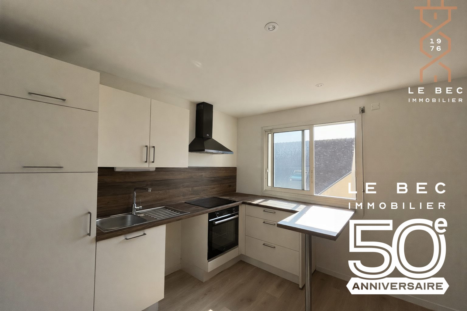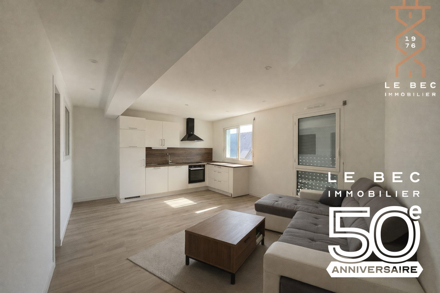 ...Une entrée avec couloir desservant un salon-séjour lumineux avec cuisine ouverte, une chambre et...