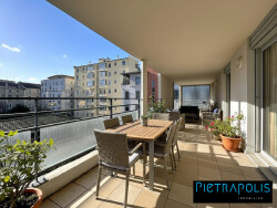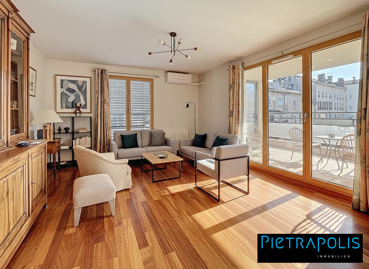 ...La terrasse plein Sud de 35 m², rare en centre-ville, offre une vue dégagée et prolonge...