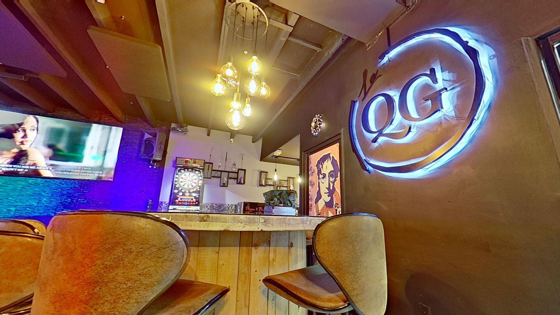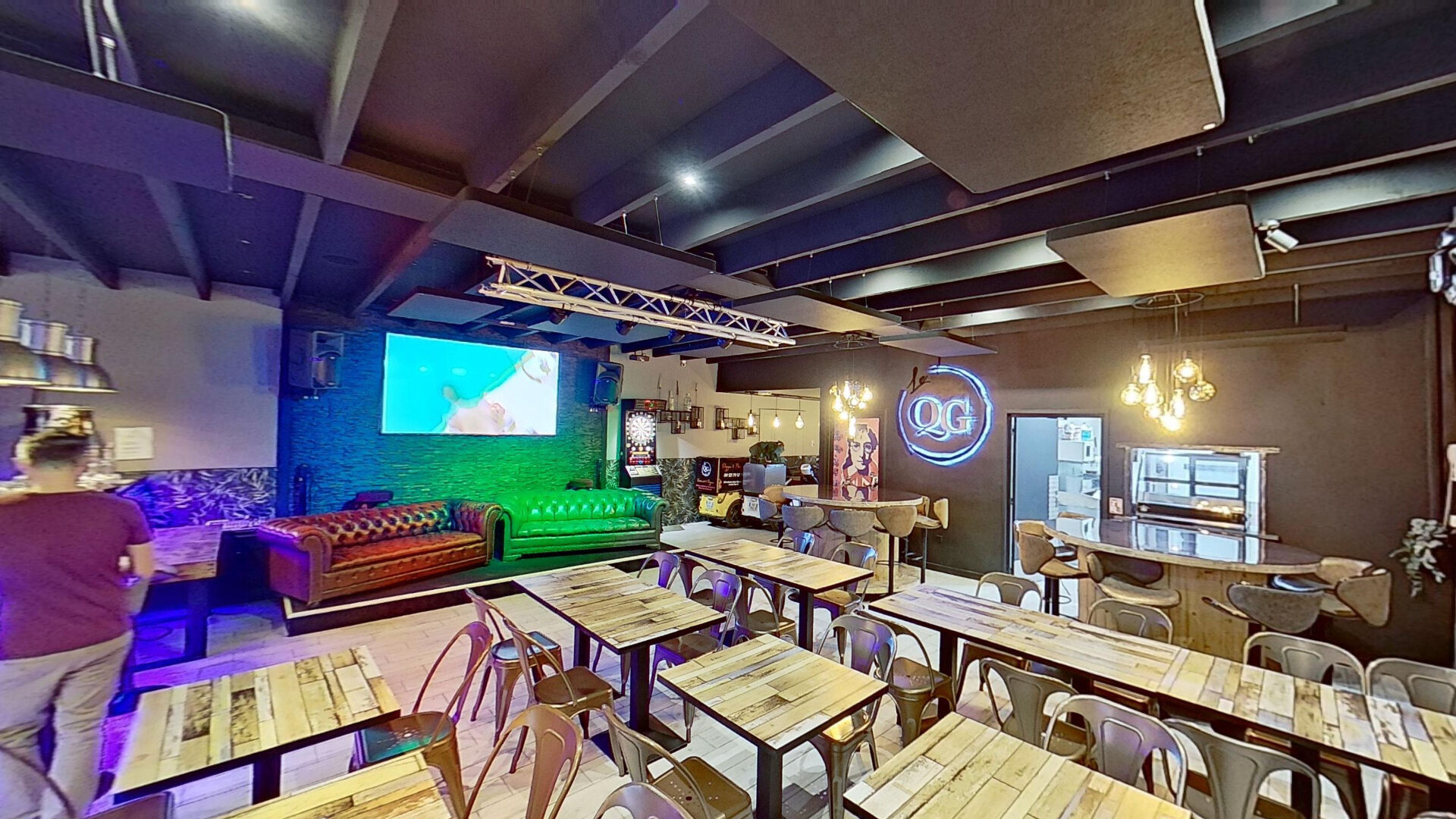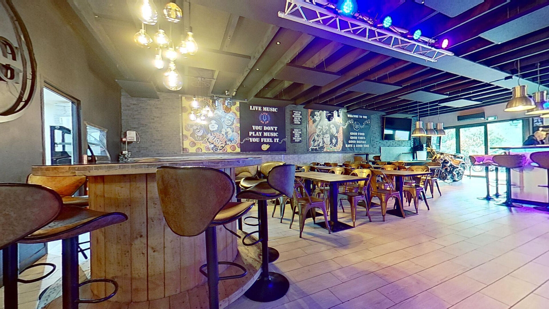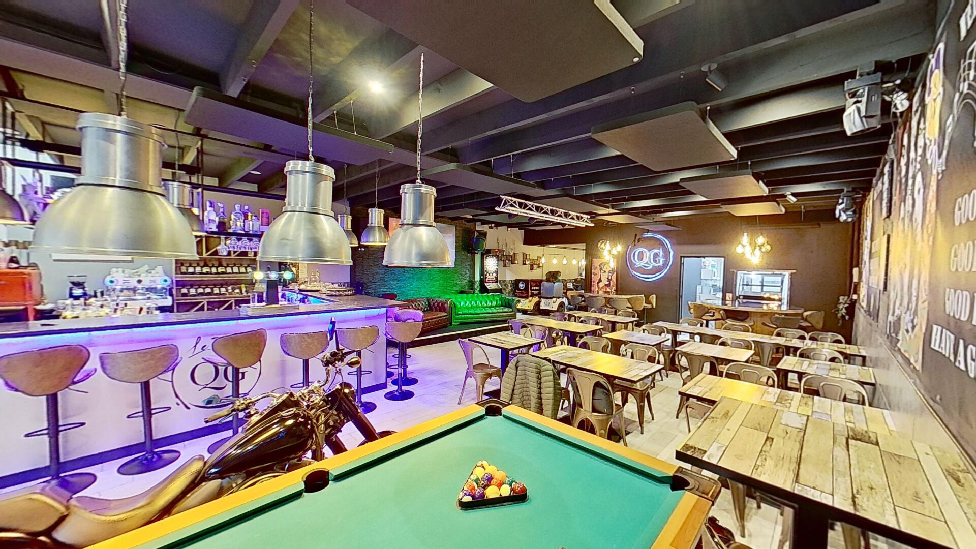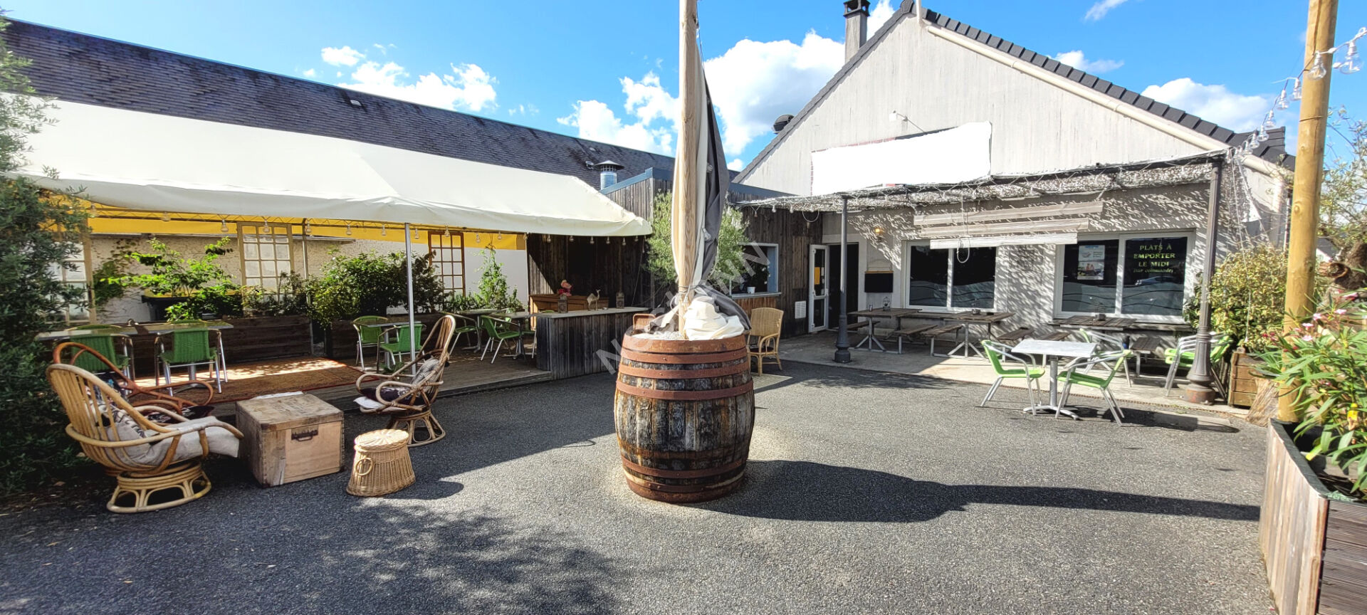 ...Grande terrasse en bois d'environ 170 m², salle intérieure, bar central et cuisine pro...