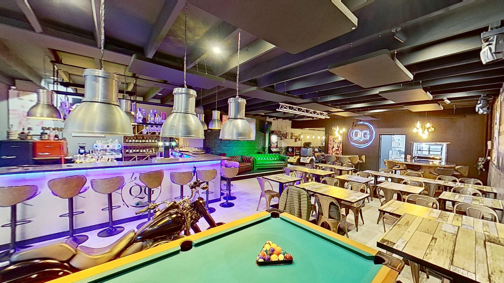 ...Grande terrasse en bois d'environ 170 m², salle intérieure, bar central et cuisine pro...