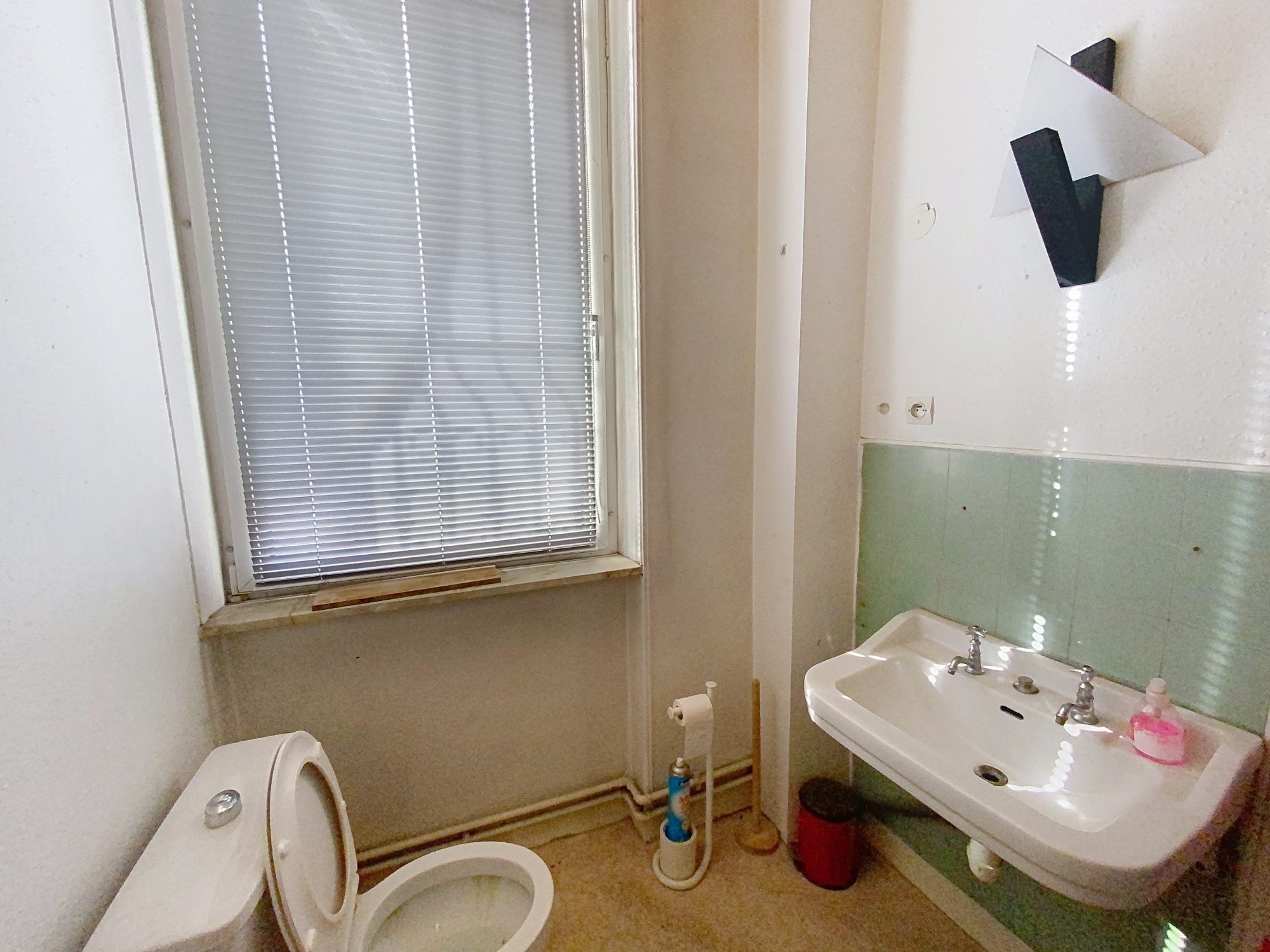 ...Il s'ouvre sur une entrée servant l'espace de travail, s'en suit des toilettes, puis une chambre...