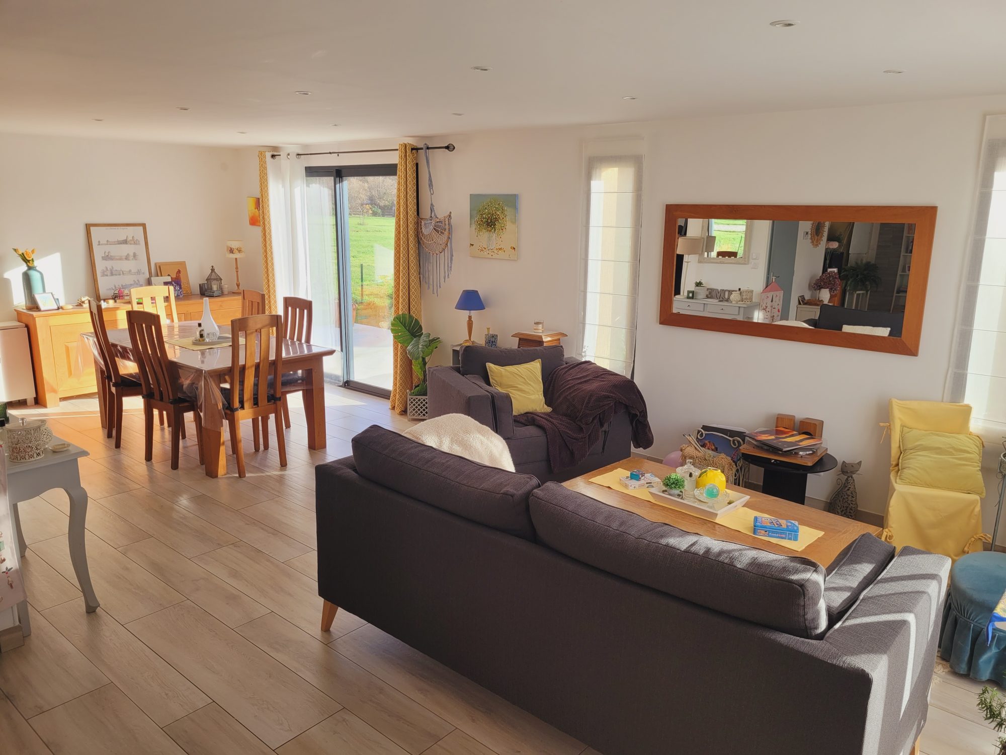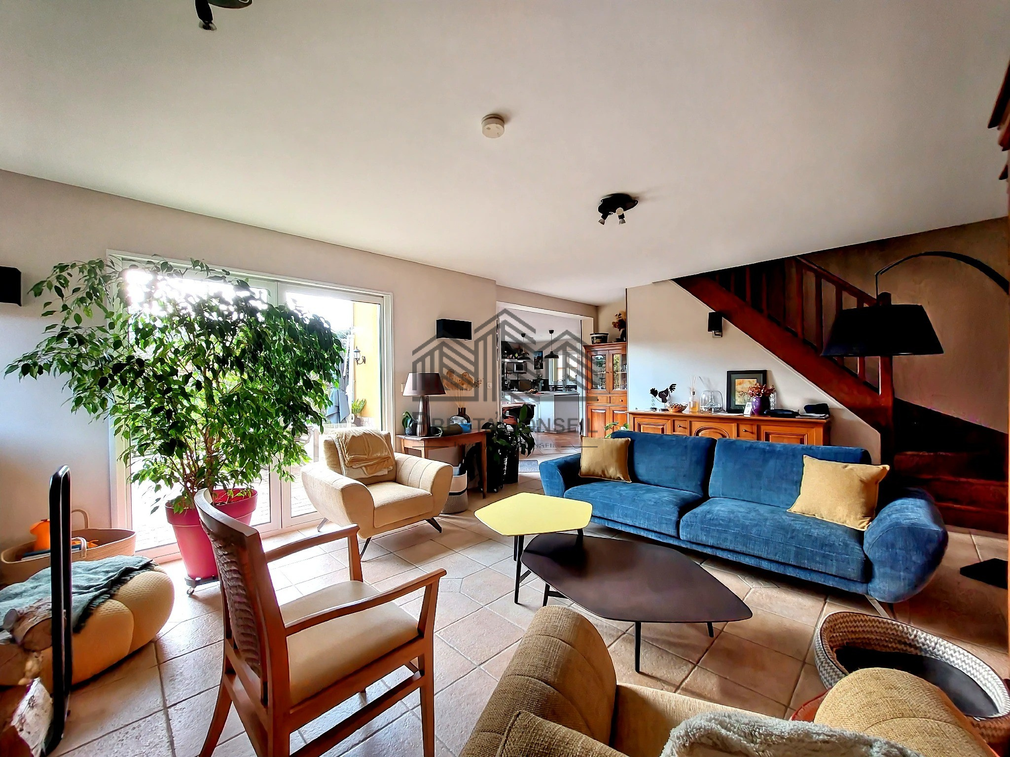...En y entrant, vous découvrirez une vaste cuisine lumineuse, ouverte sur son séjour avec cheminée...