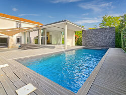 ...La façade, délicatement teintée de rose poudré, apporte de la sobriété à la villa, tandis que les...