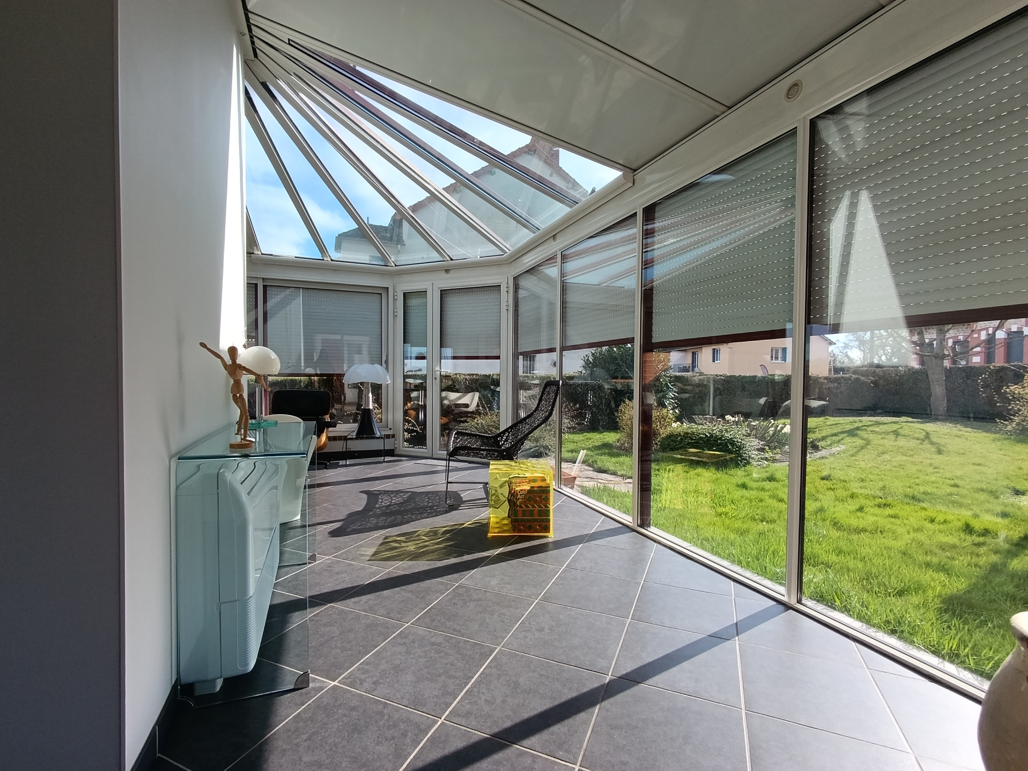 ...Vous y trouverez le coin salon, où des portes-fenêtres donnent accès à une véranda fermée et...
