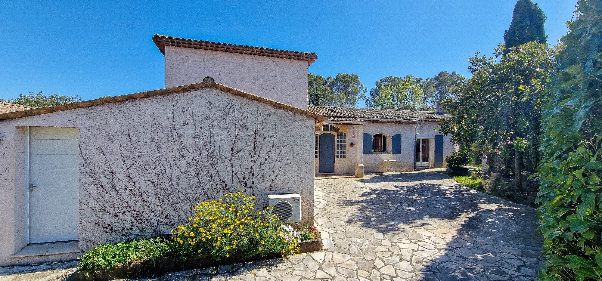 ...Implantée sur un terrain plat de 4000 m², cette propriété offre une vue dégagée sur les collines...