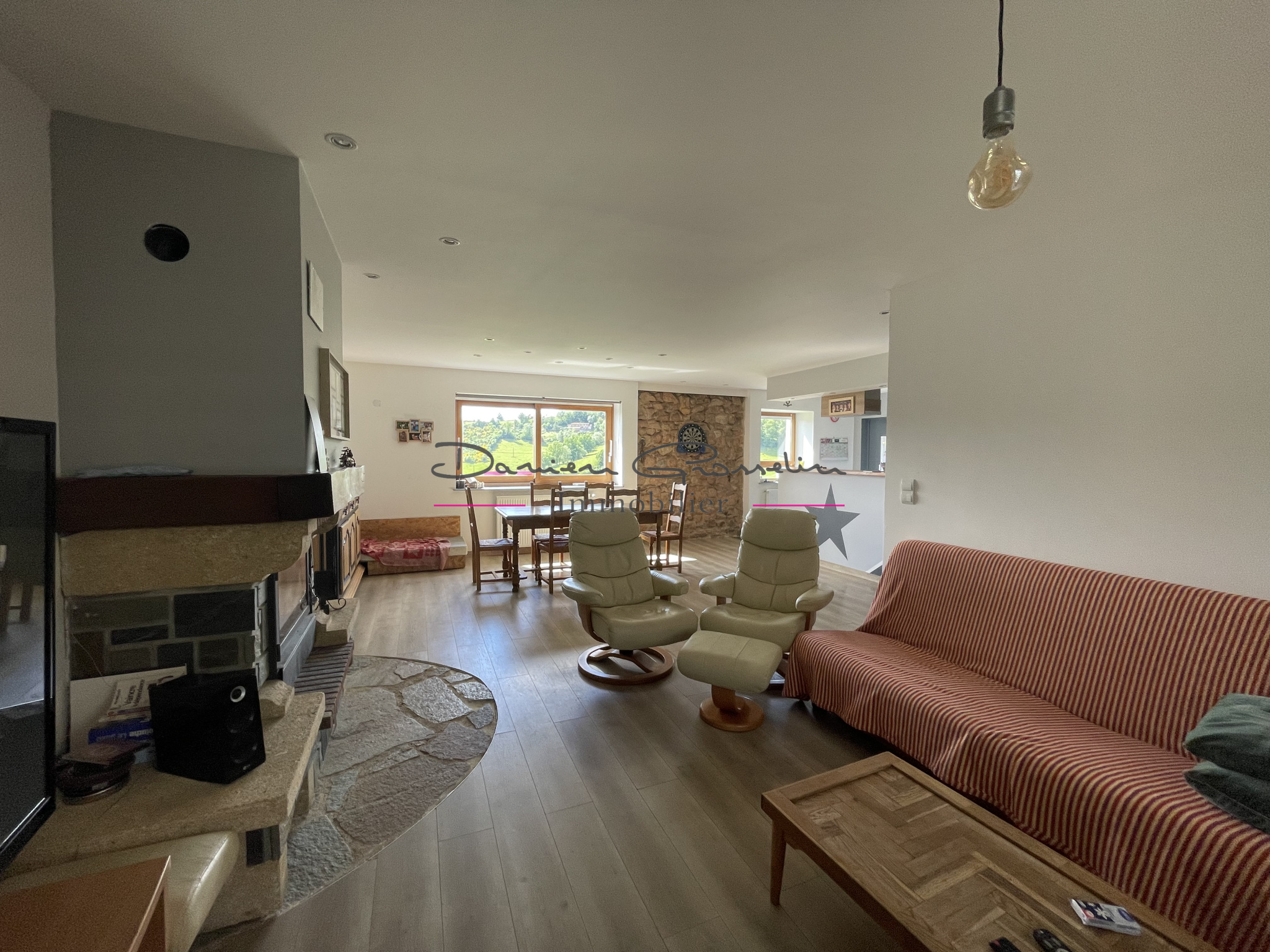 ...Au rez-de-chaussée, une vaste pièce de vie baignée de lumière avec cheminée et cuisine américaine...