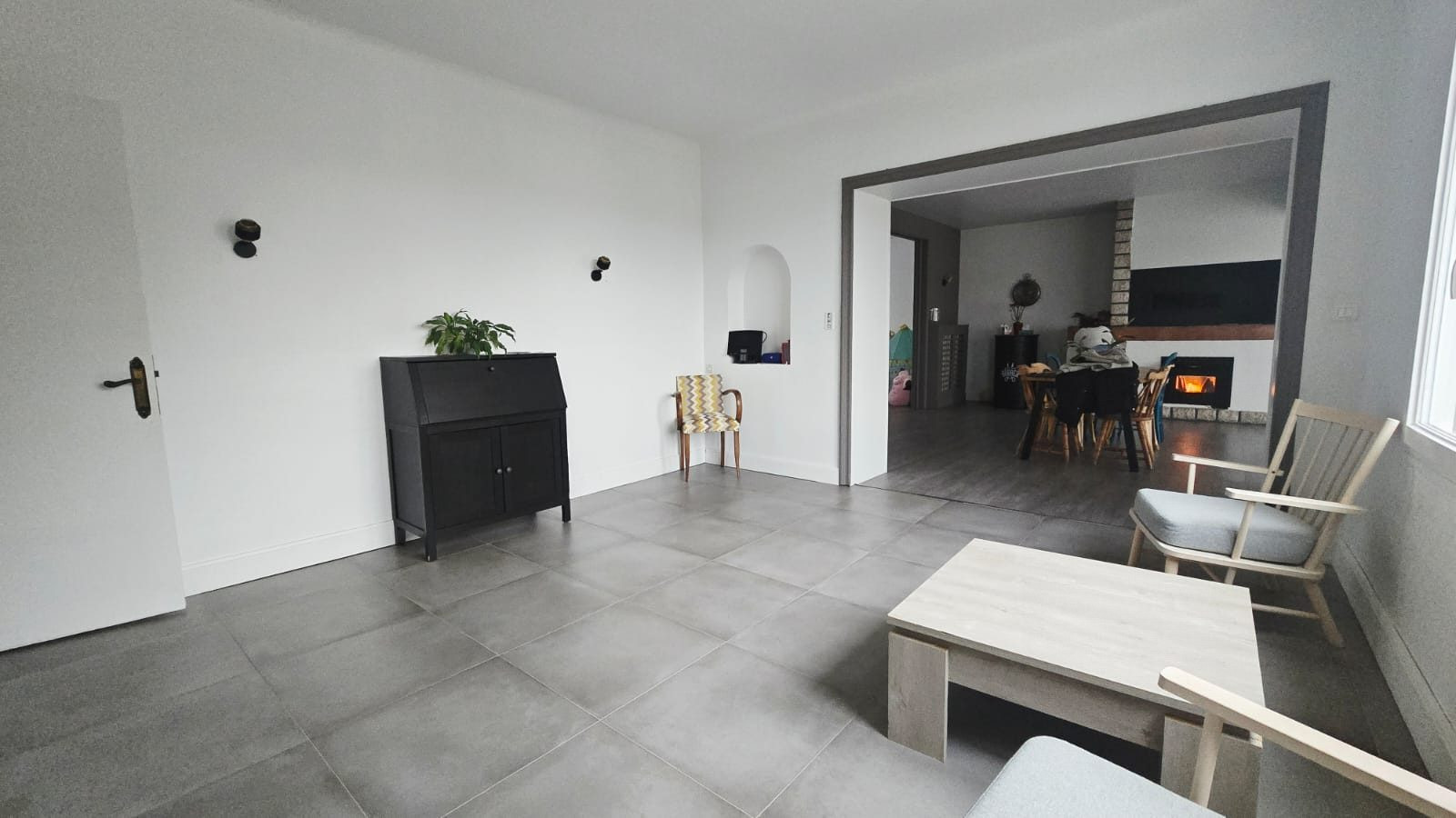 ...Rez-de-chaussée :Jolie entrée avec arche en pierre, vaste salon séjour de 60 m² avec cheminée...