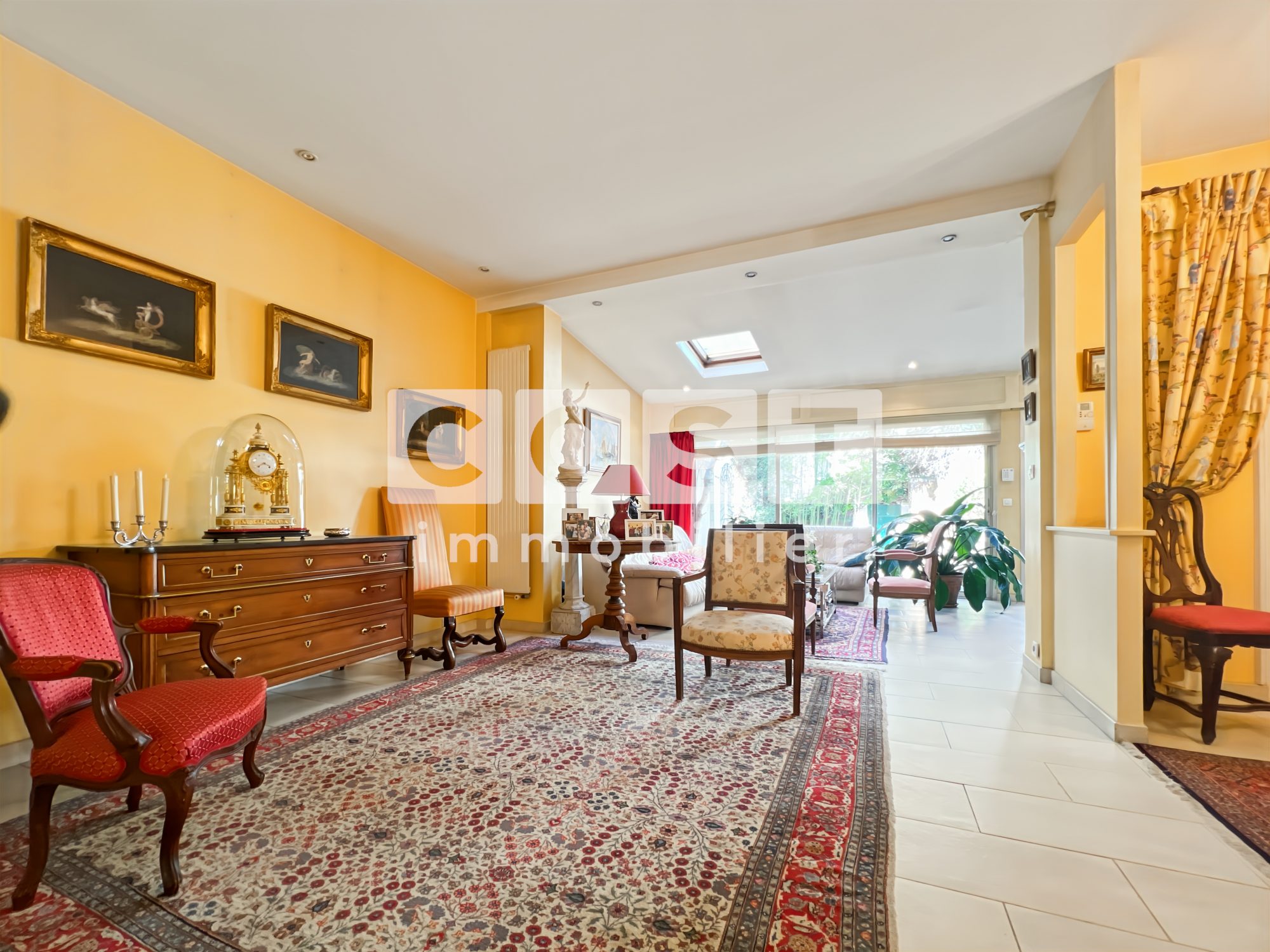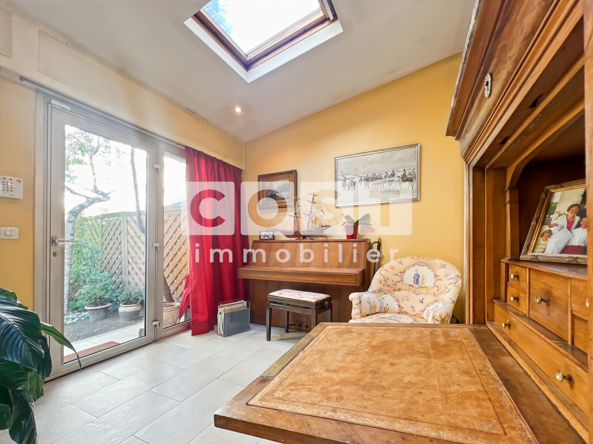 ...Elle se compose d'un double séjour donnant sur un jardin calme et arboré de 80 m², d'une cuisine...