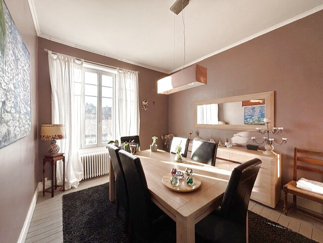 ...Un escalier en bois dessert à l'étage salle à manger de 27 m2, séjour de 30 m2 avec cheminée,...