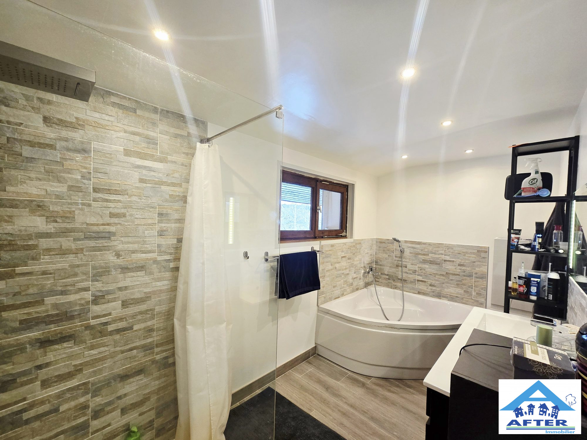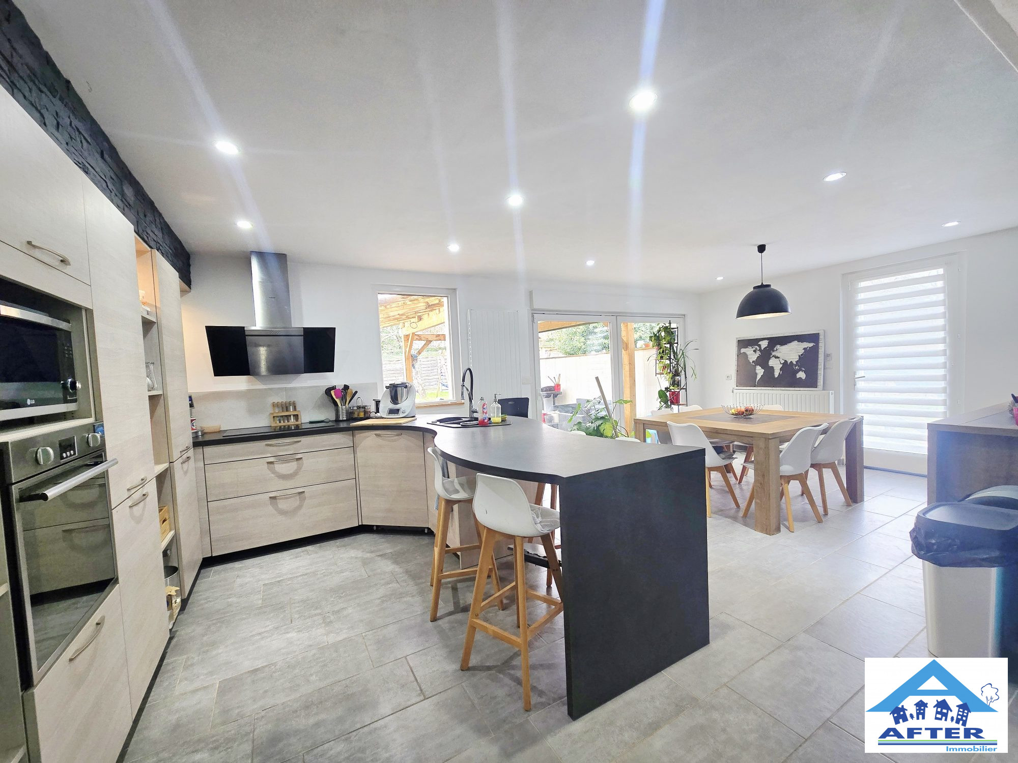 ... entrée, cuisine moderne ouverte sur salon, WC.
