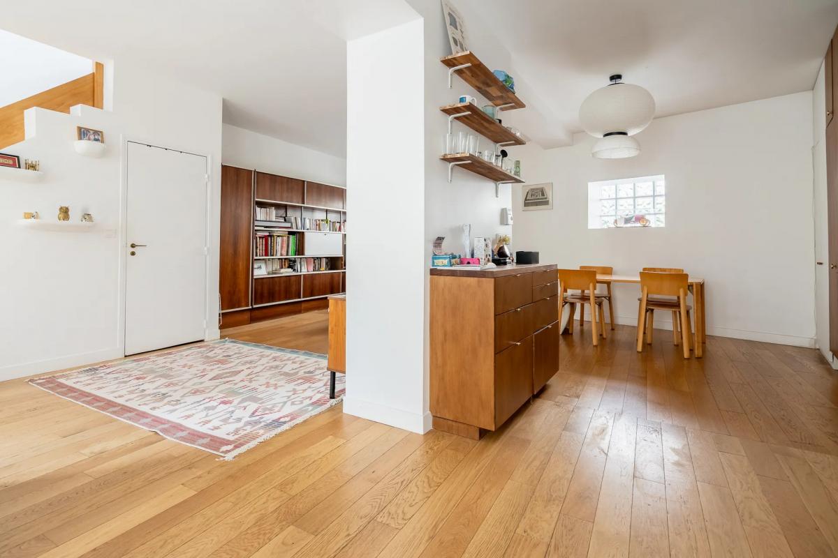 ... à l'américaine, mezzanine sur séjour, une chambre, salle d'eau avec WC. Au rdc : Deux chambres, gar...