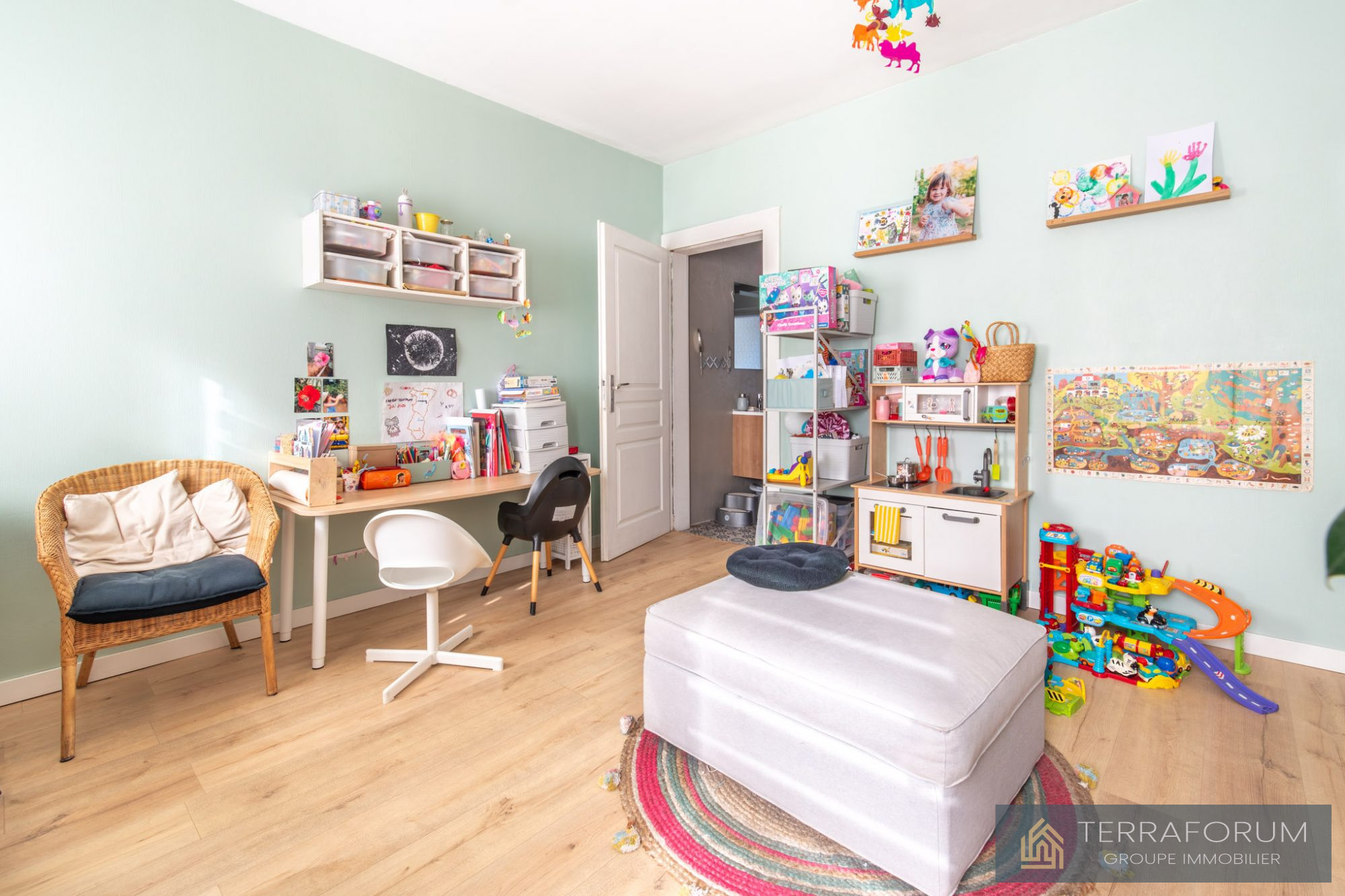 ...Dès l'entrée, vous découvrez un bel espace de vie de 45 m², composé d'un salon et d'une salle à...