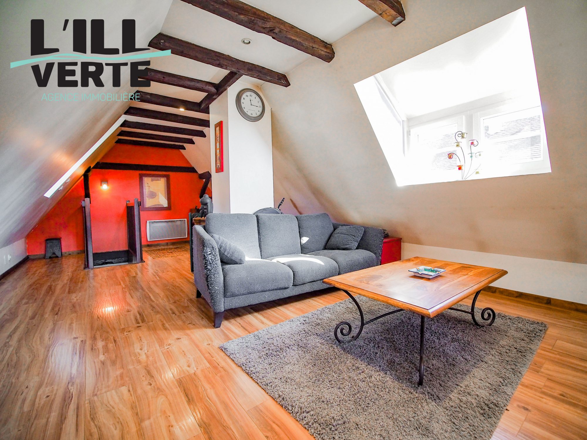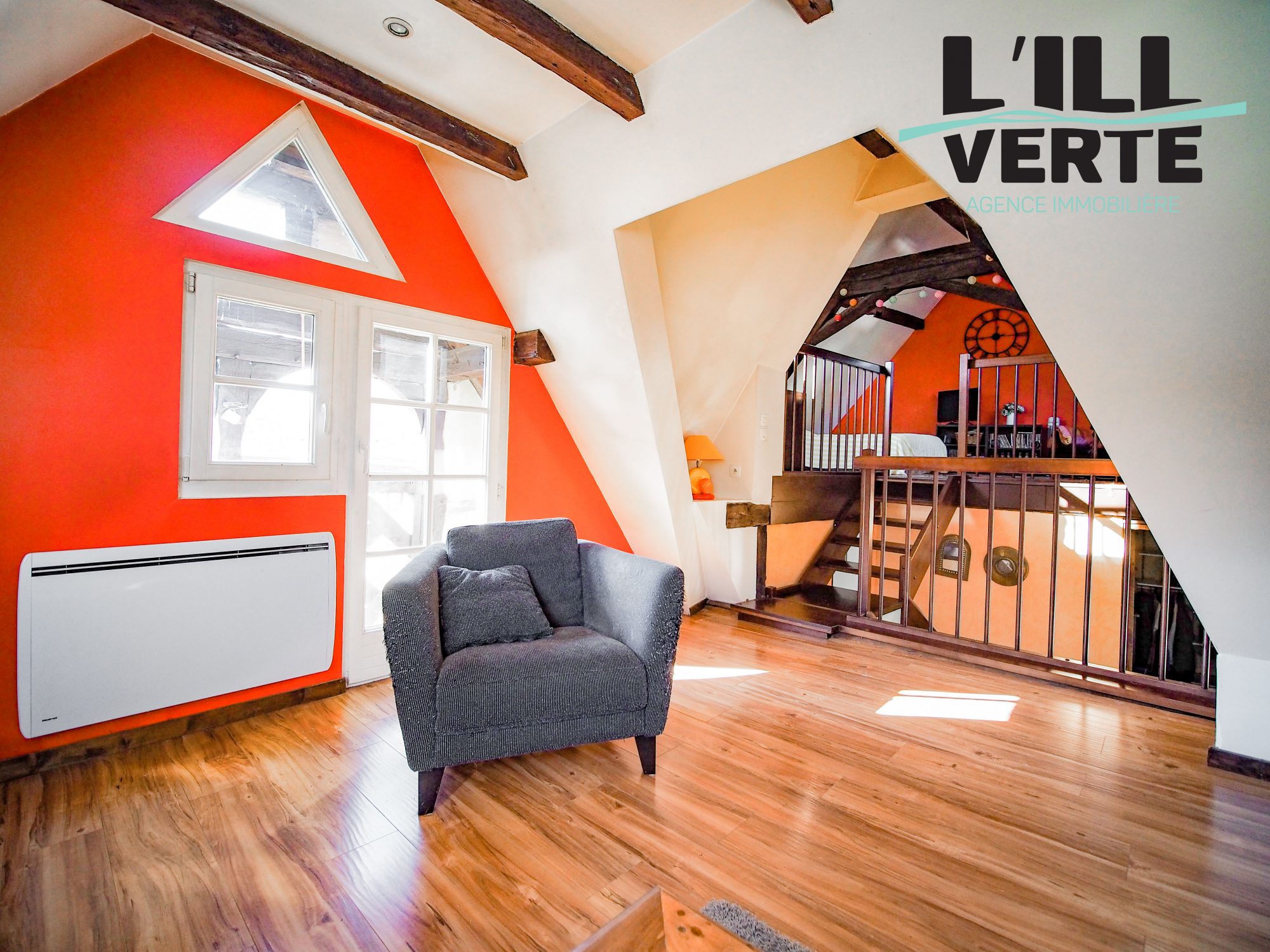 ...Un escalier bois mène au grenier :Un beau volume disponible et aménageable avec plancher bois...