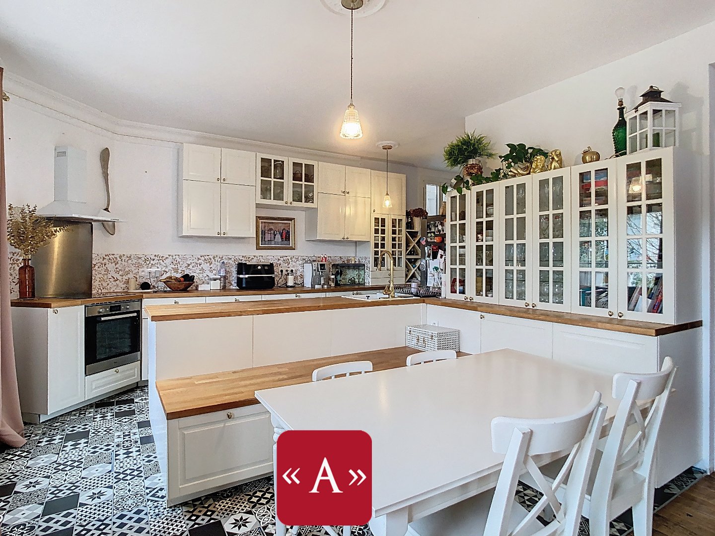 ...Au rez-de-chaussée, l'entrée se fait par la cuisine dînatoire, aménagée et équipée, avec...