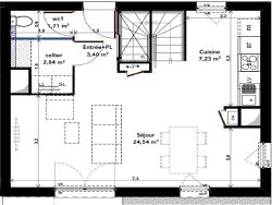 ...Elle s'organise comme suit : une pièce à vivre, trois chambres, une salle de bains, une salle...