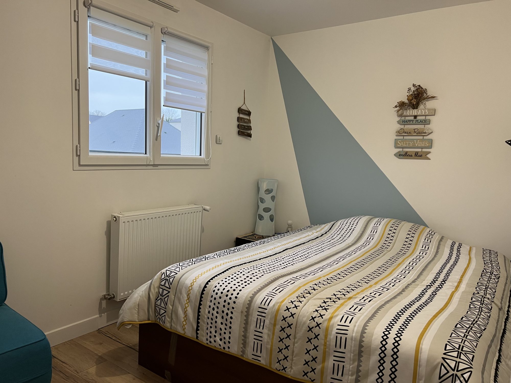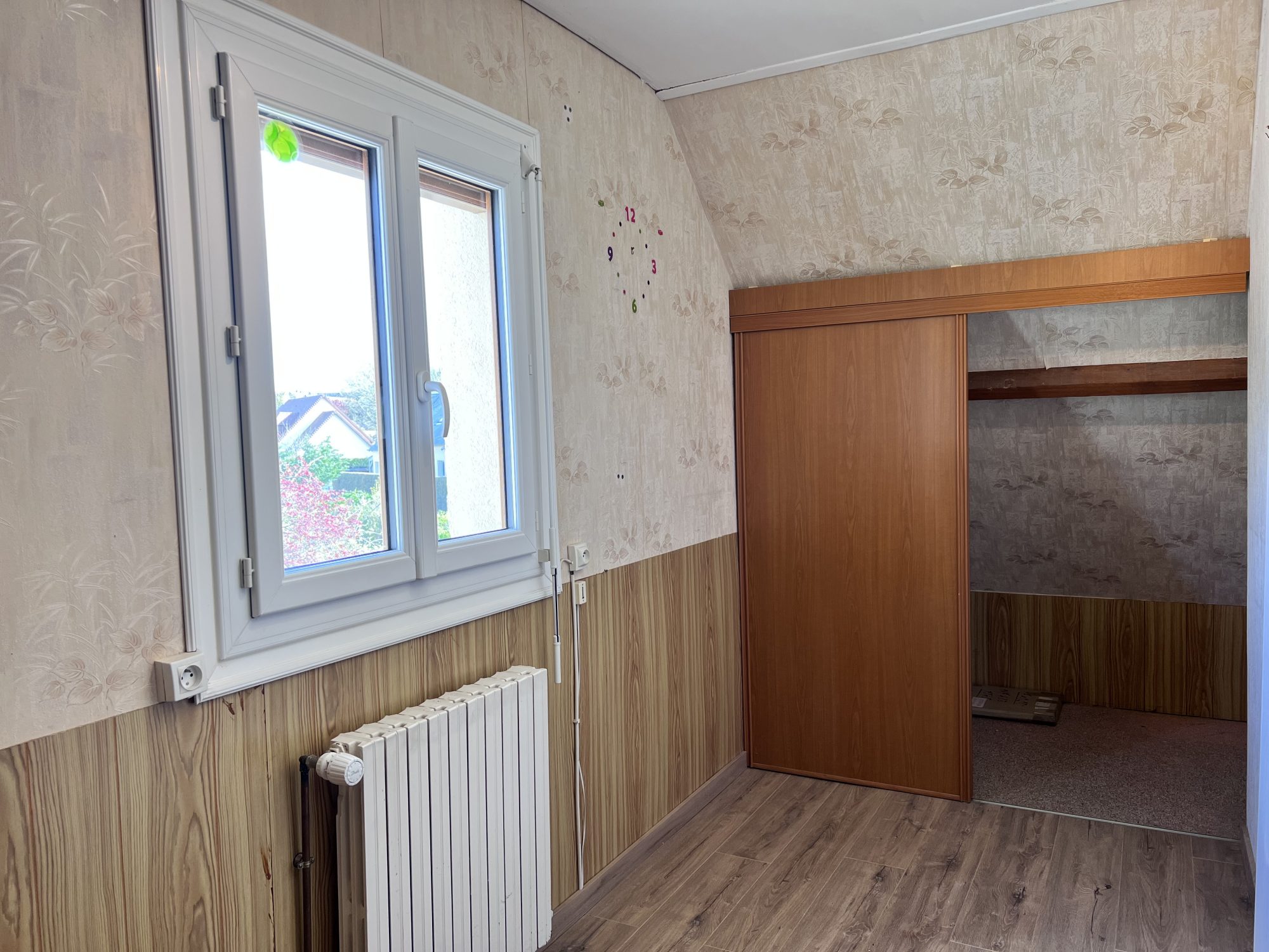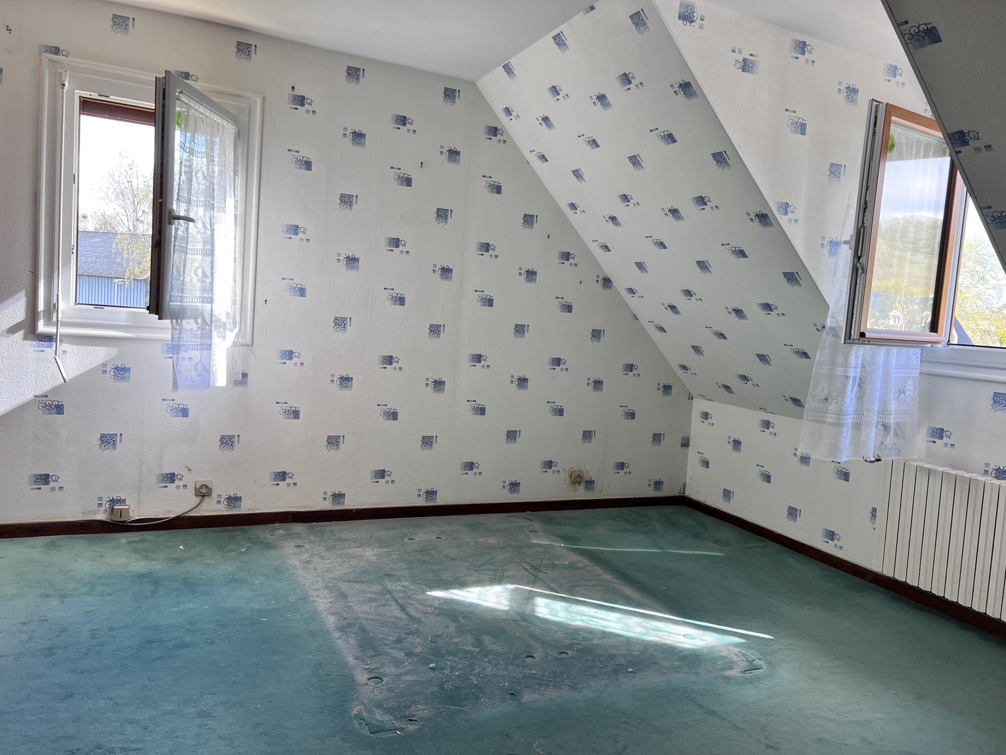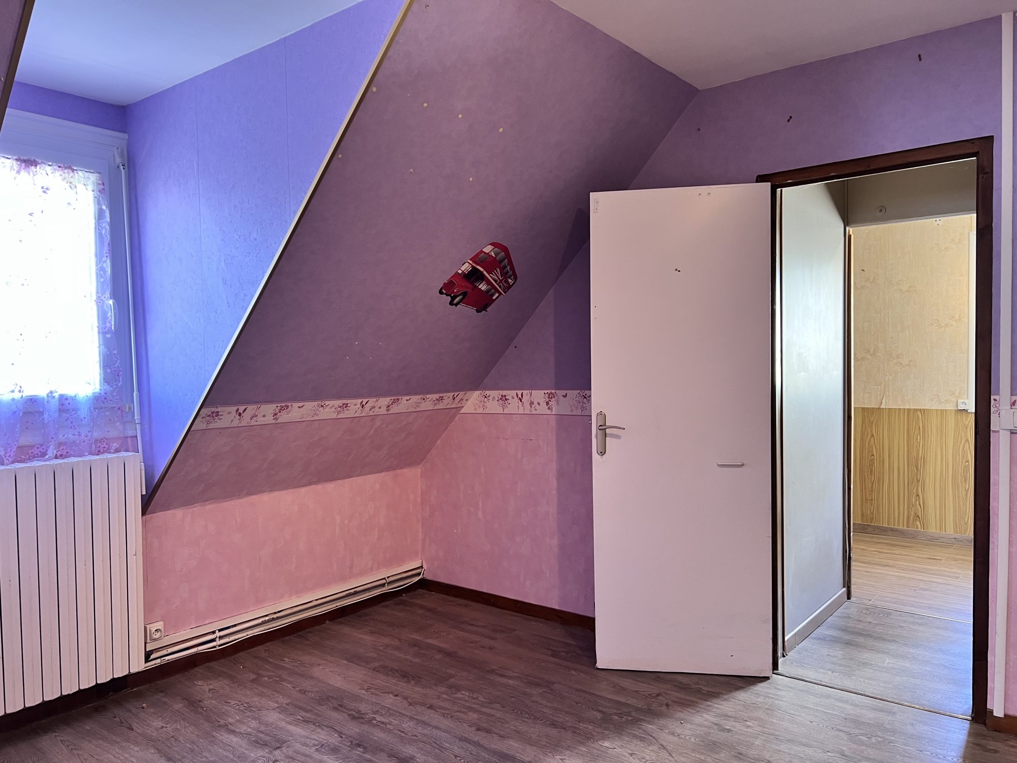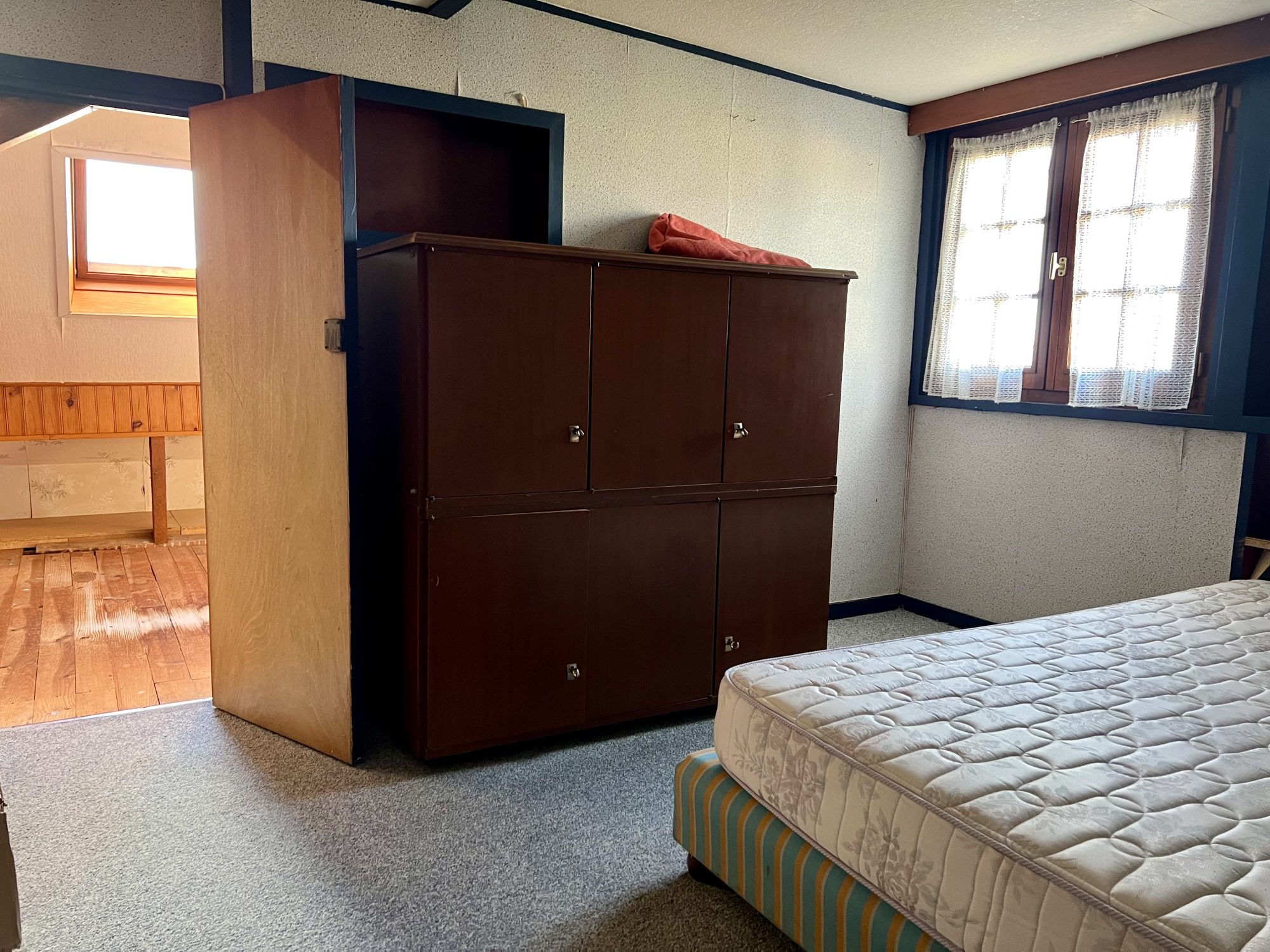 ...A l'étage, un couloir dessert une salle de bains, 2 chambres communicantes et une indépendnate...