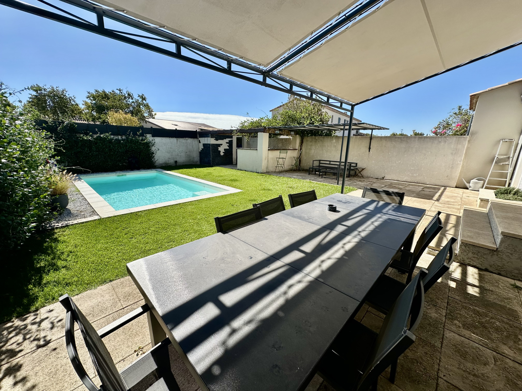 ...Vous profiterez d'une grande terrasse plein sud sans vis-à-vis, d'une piscine avec son pool house...