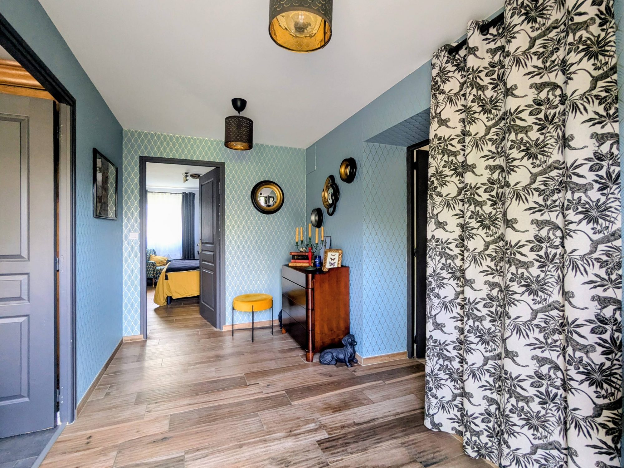 ...Depuis l'entrée, on accède à une arrière-cuisine, à la cuisine et à une première suite parentale...