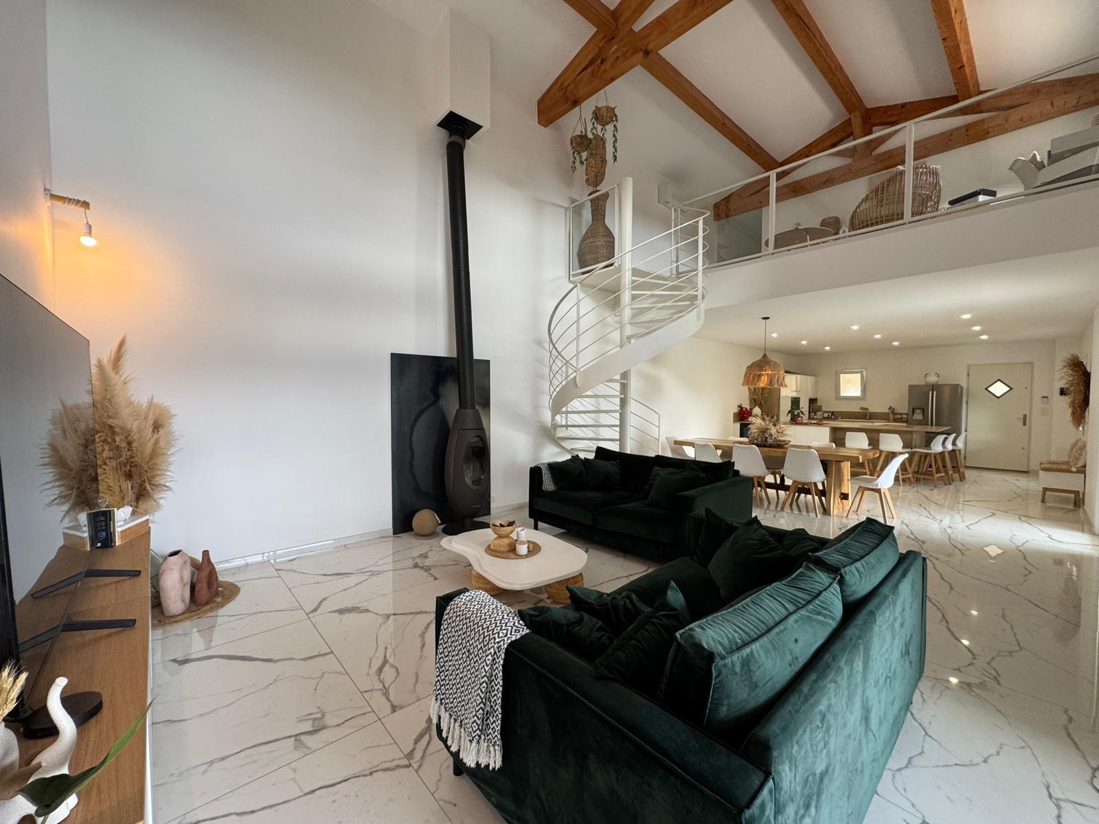 ...En rez-de-chaussée : une pièce de vie XXL avec 6 m de hauteur sous plafond, baignée de lumière...