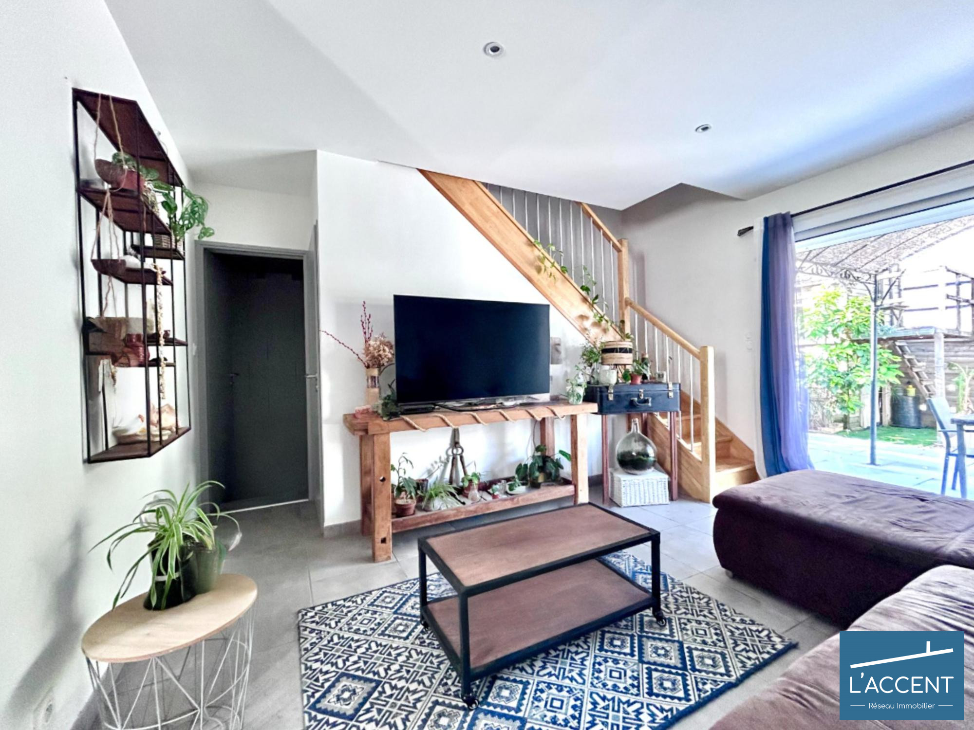 ...L'entrée s'ouvre sur un espace de vie élégant et chaleureux, où le salon et la cuisine aménagée...