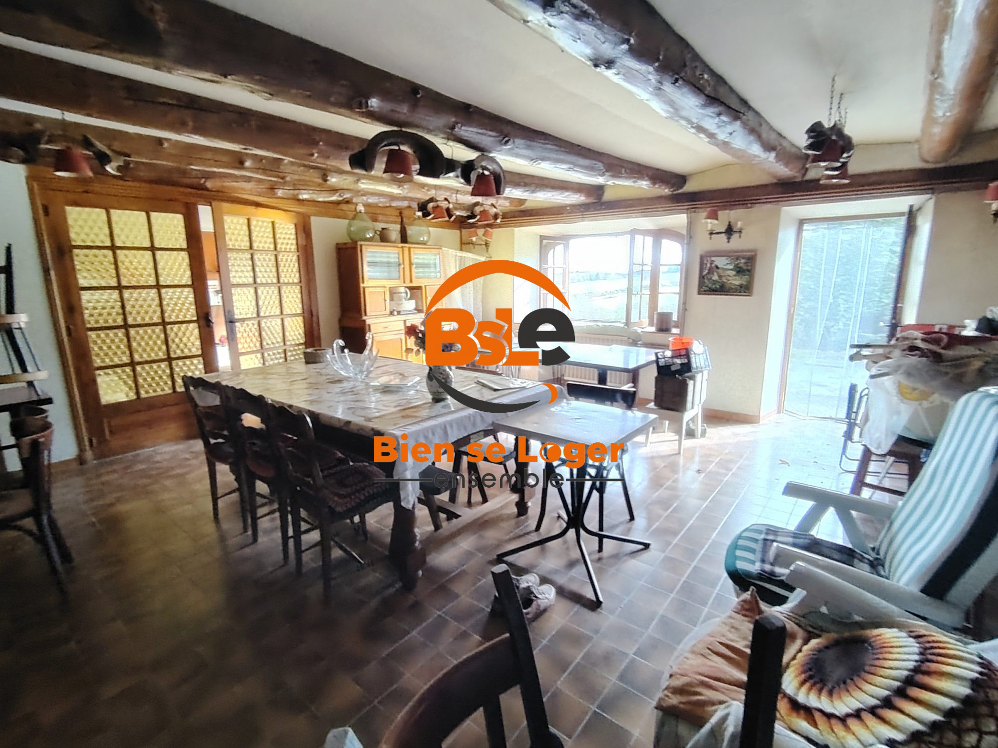 ...Entrée désservant une salle à manger avec son coin cuisine, un grand salon, un wc...