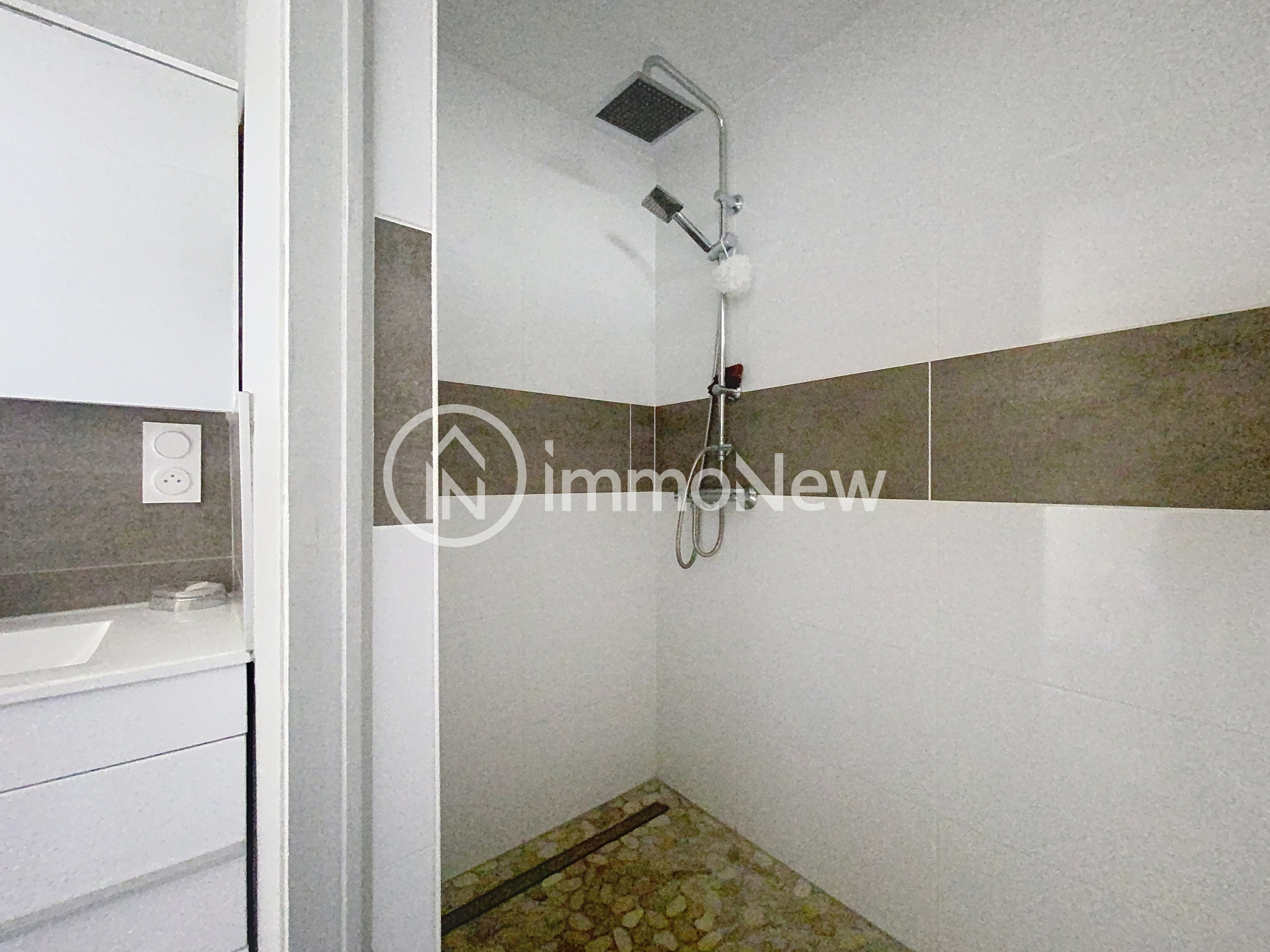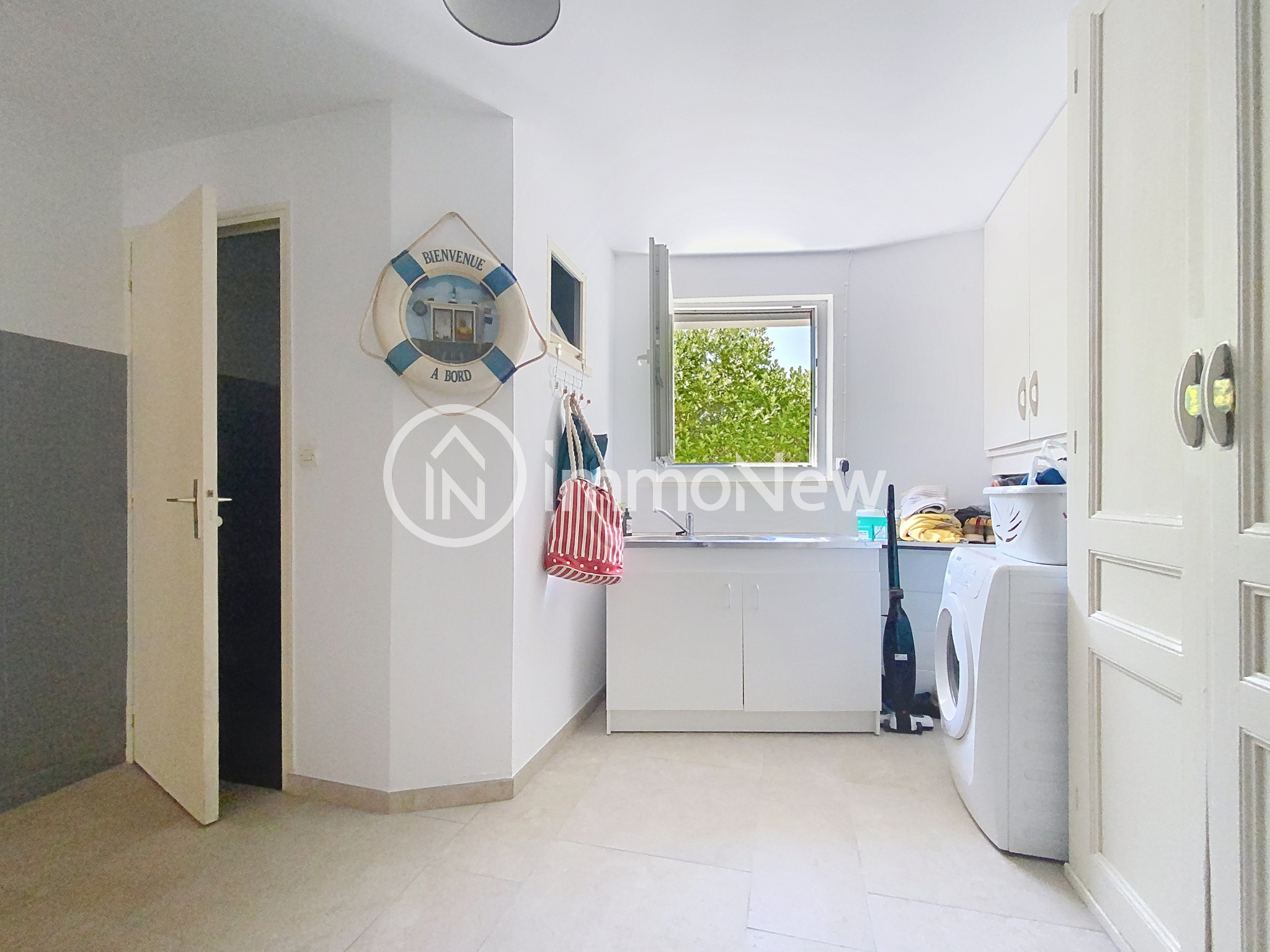 ...Vous arrivez sur la terrasse et le jardinet bien exposée donnant sur un salon puis une cuisine...