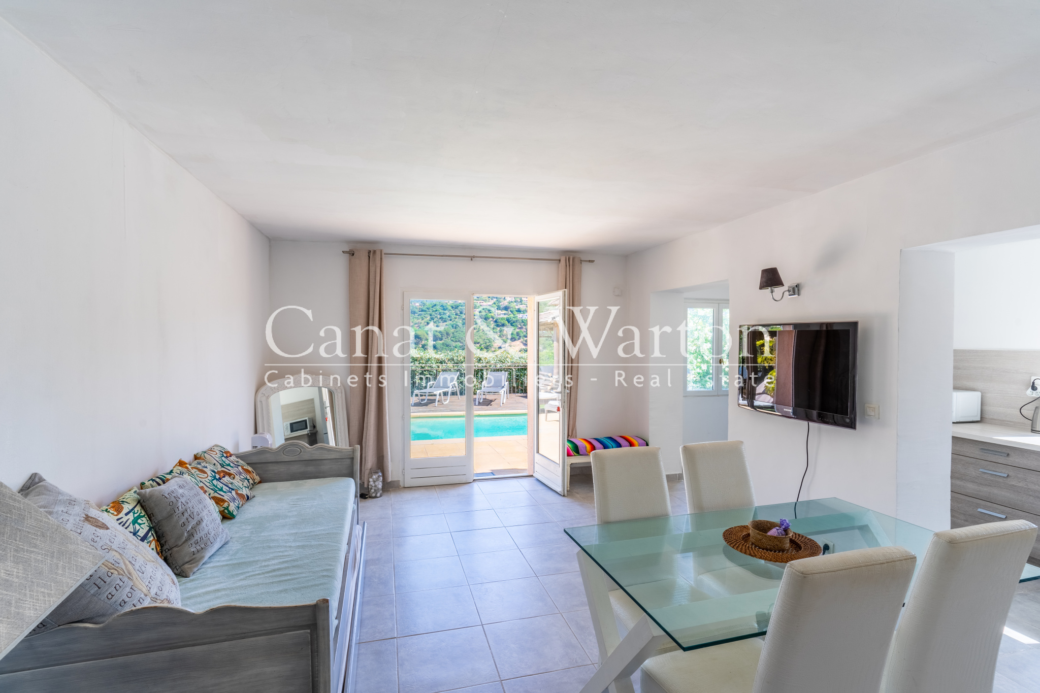 ... cette villa rénovée à Cavalaire avec piscine et une petite vue mer. Idéalement située au calme dans...